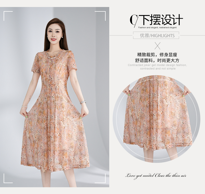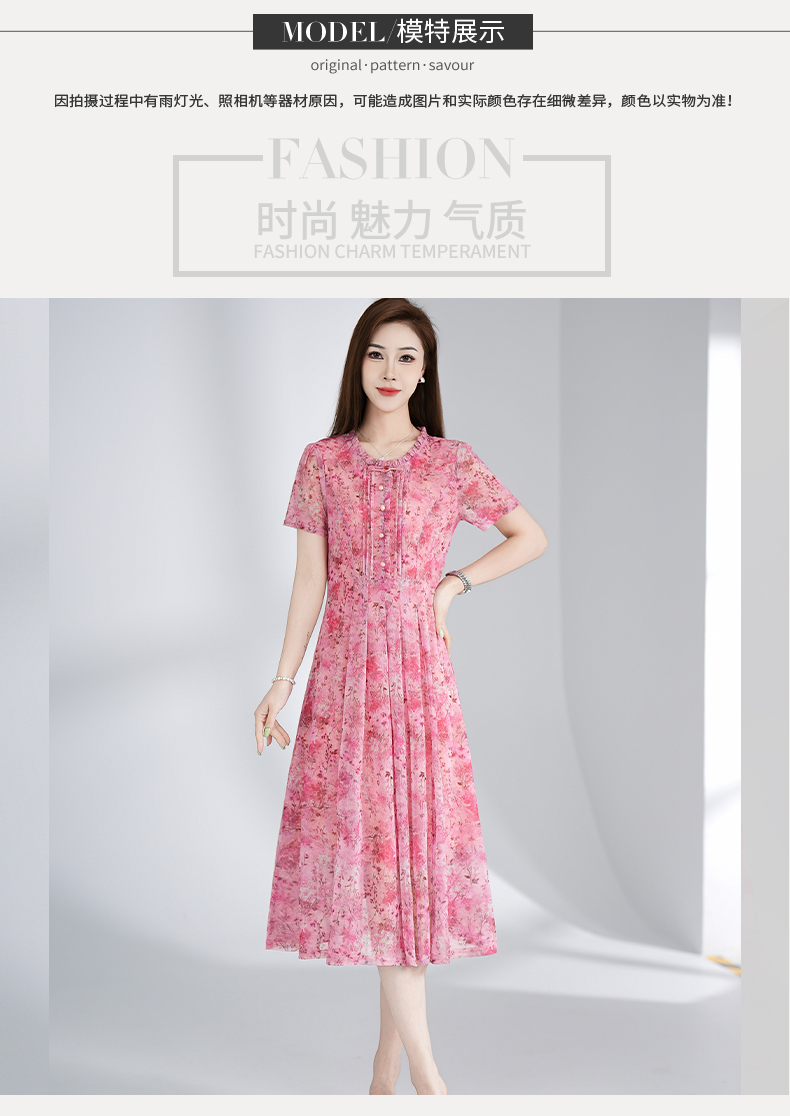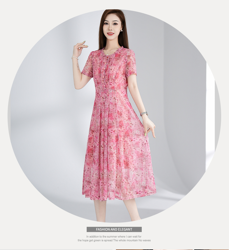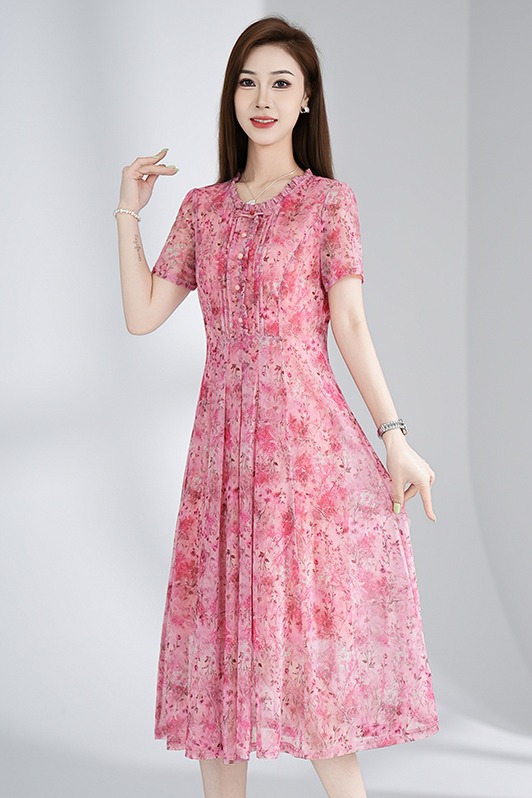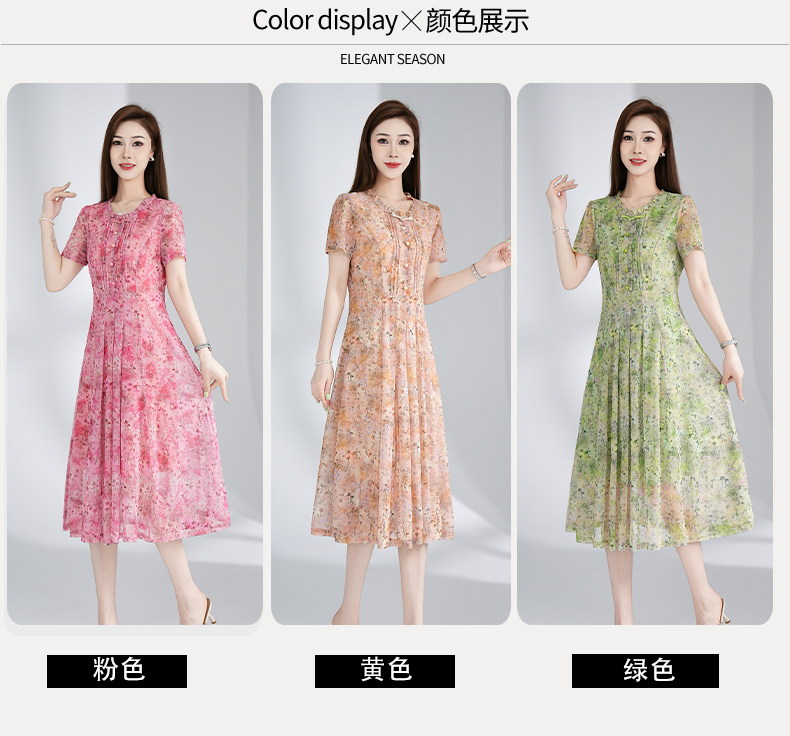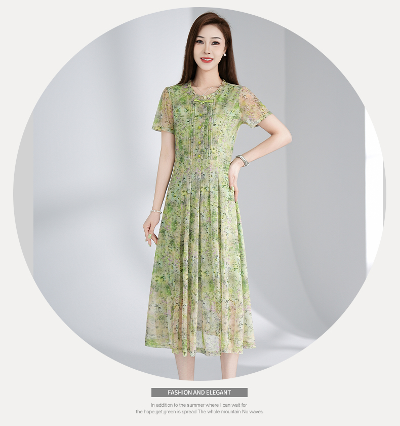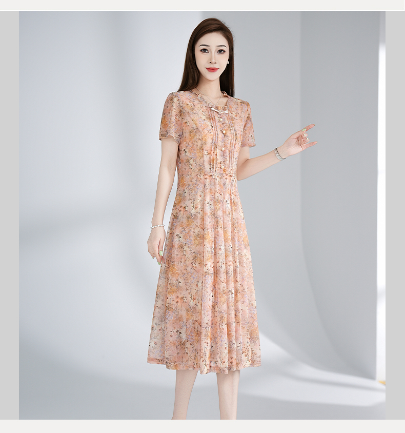 RY3495#夏季新款短袖连衣裙网纱印花裙子收腰显瘦透气