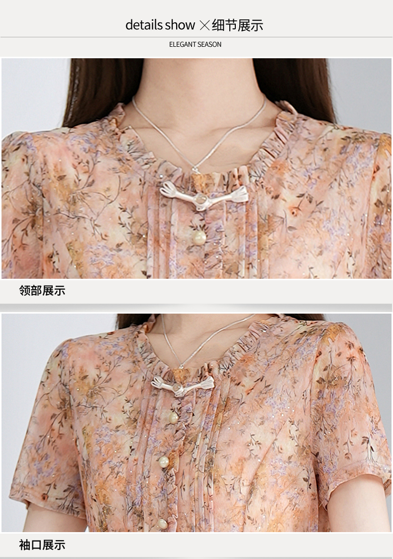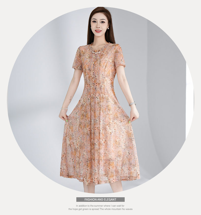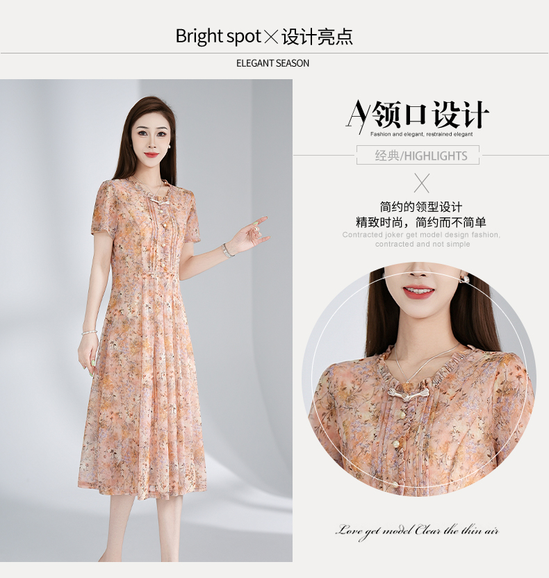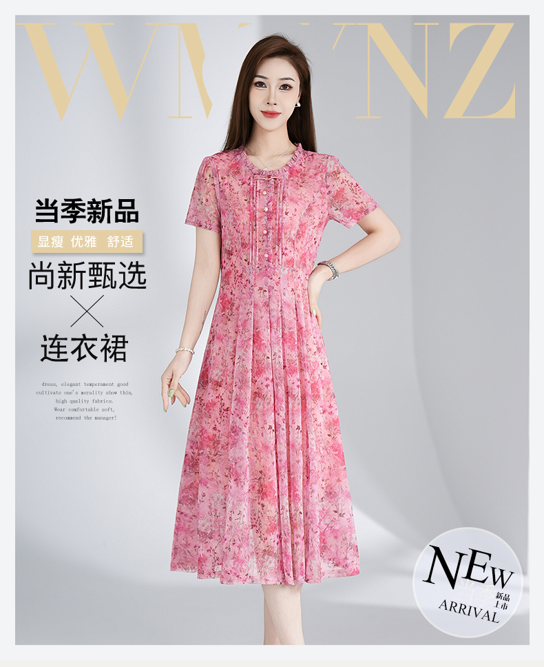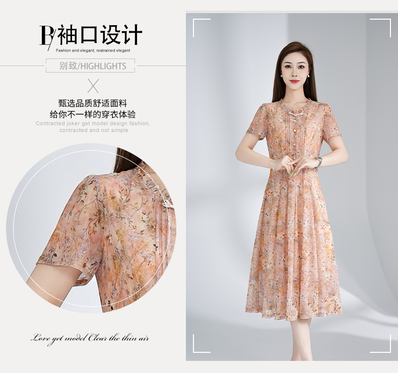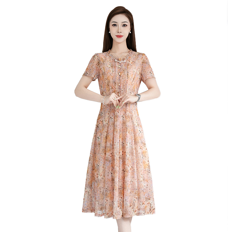 RY3495#夏季新款短袖连衣裙网纱印花裙子收腰显瘦透气