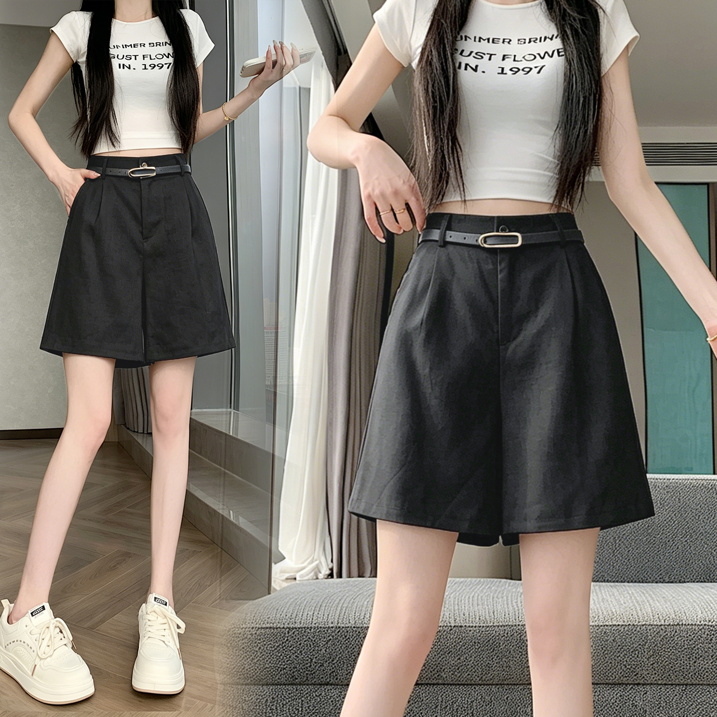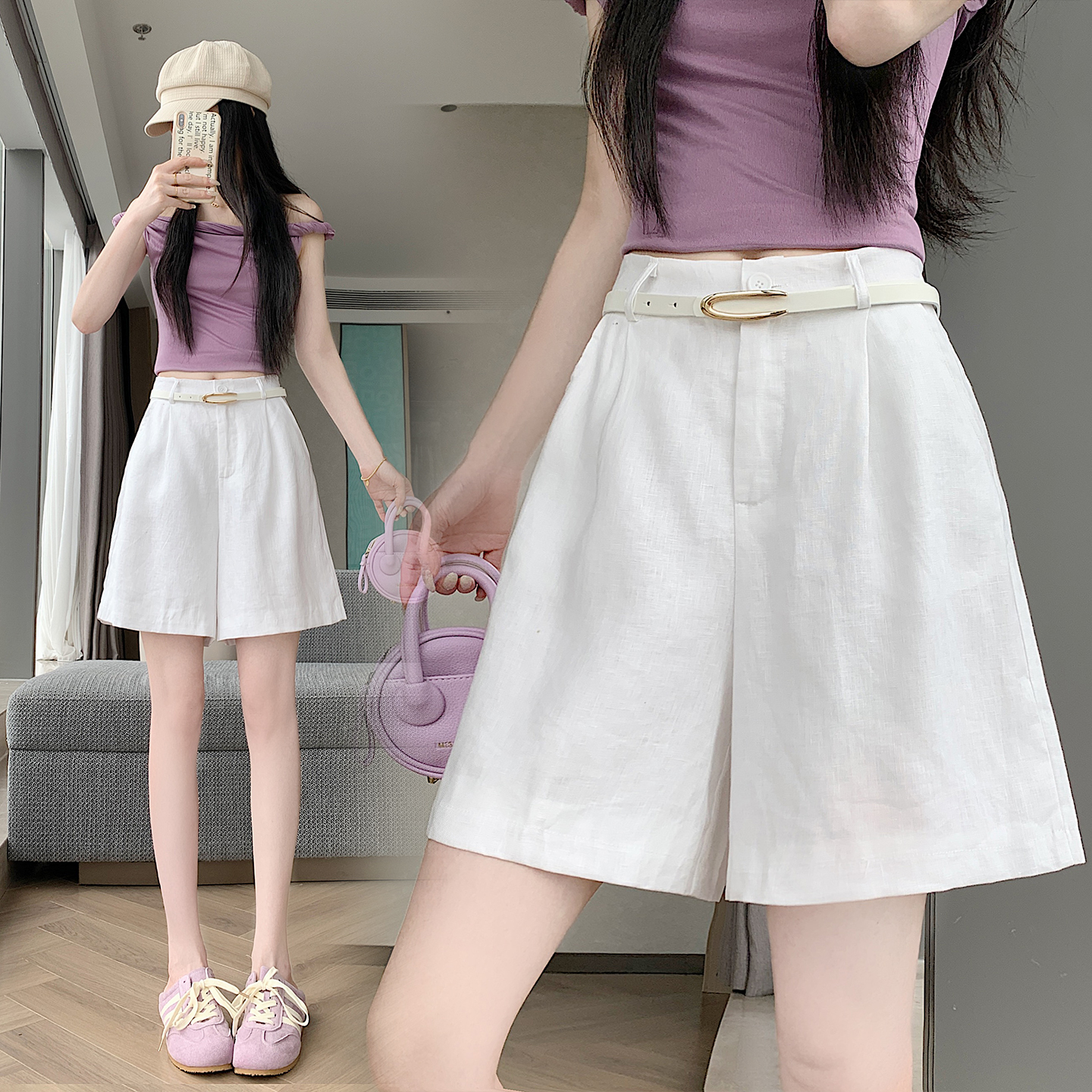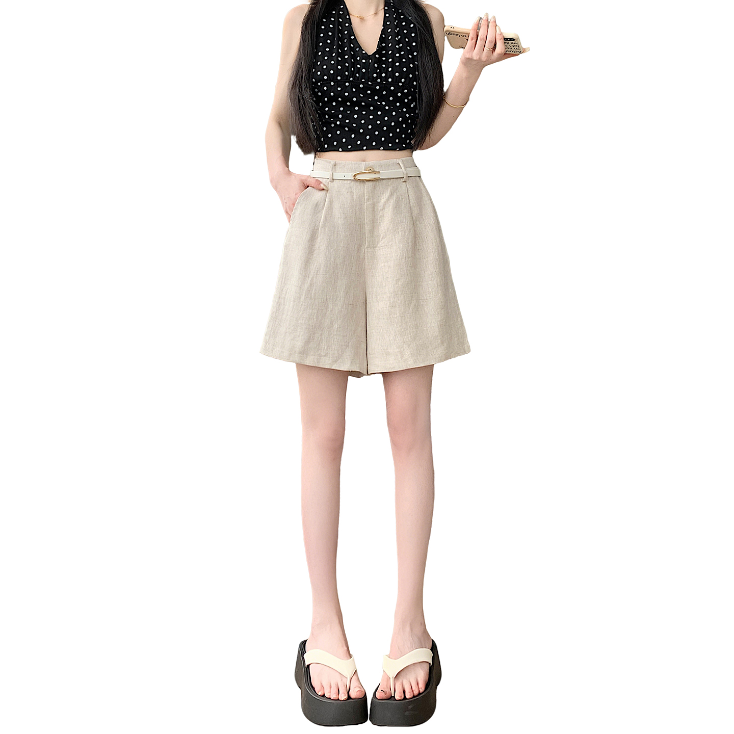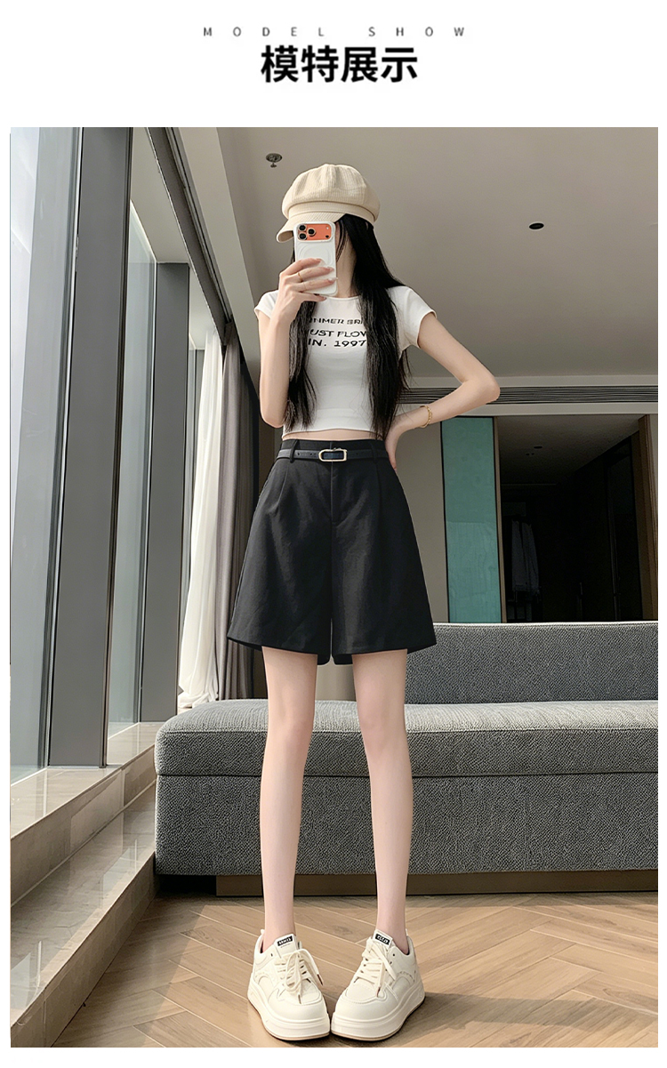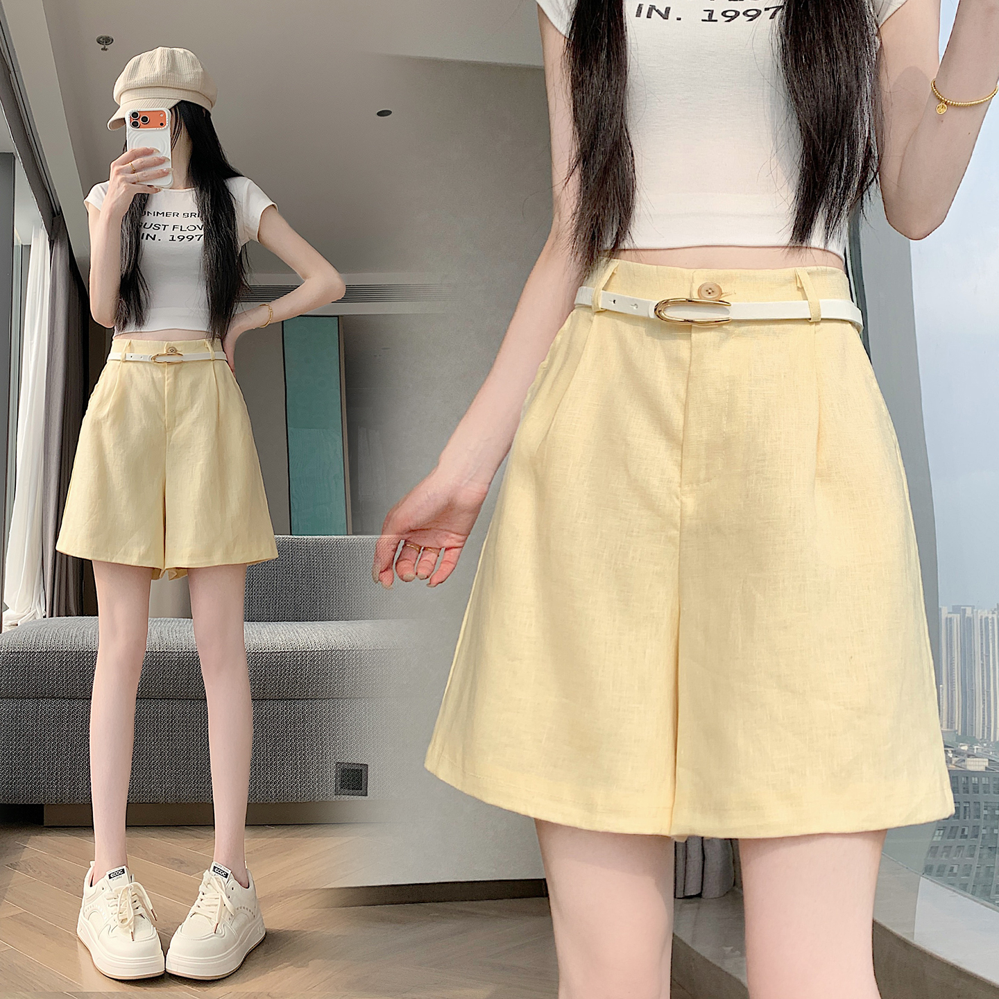 RY4281# 实拍2026新版网红辣妹高级亚麻面料百搭高腰短裤 阔腿裤配送腰带