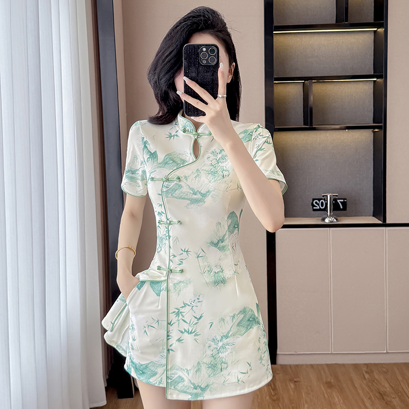MY9138# 新款国风改良旗袍裙夏季新中式复古年轻少女款收腰短袖连衣裙套...