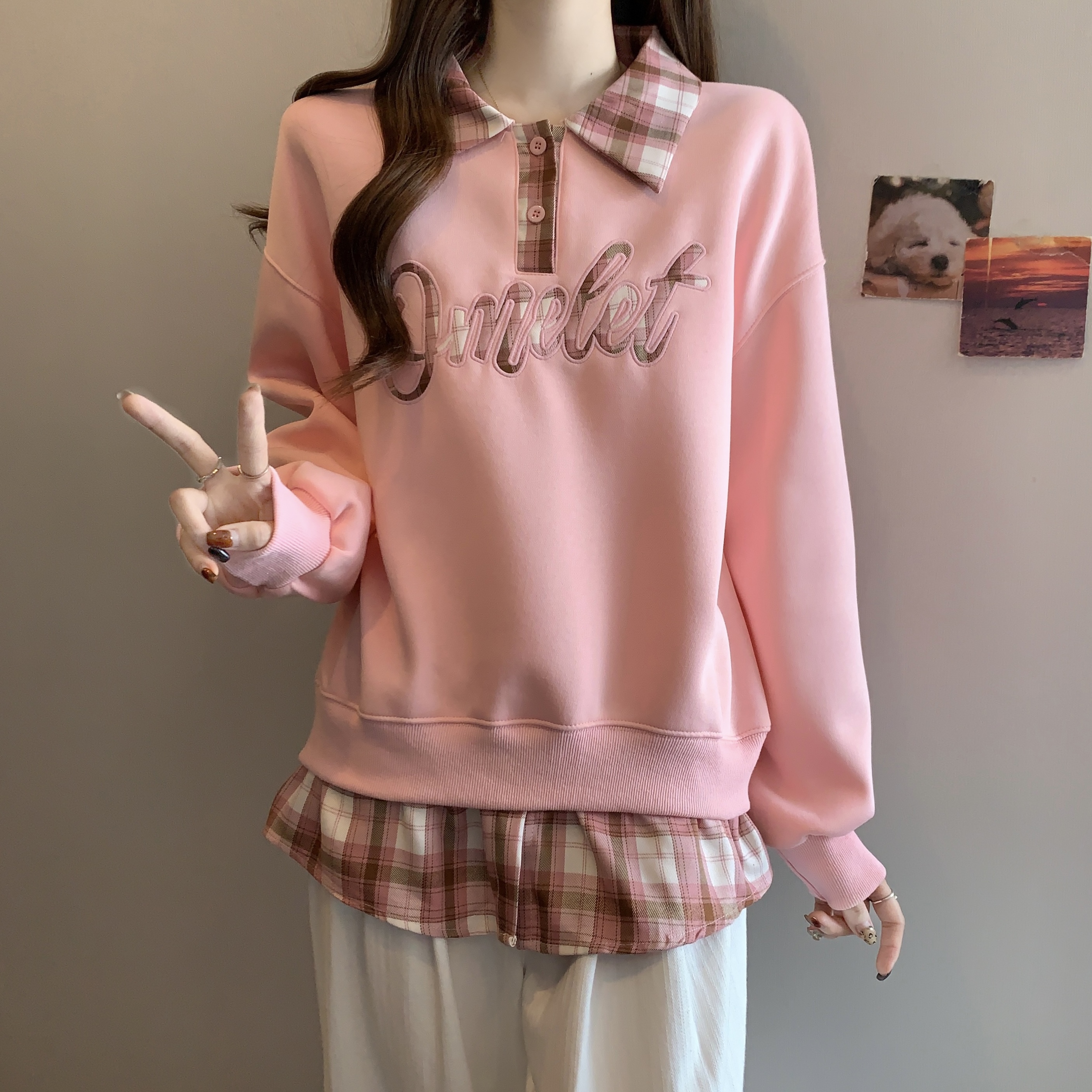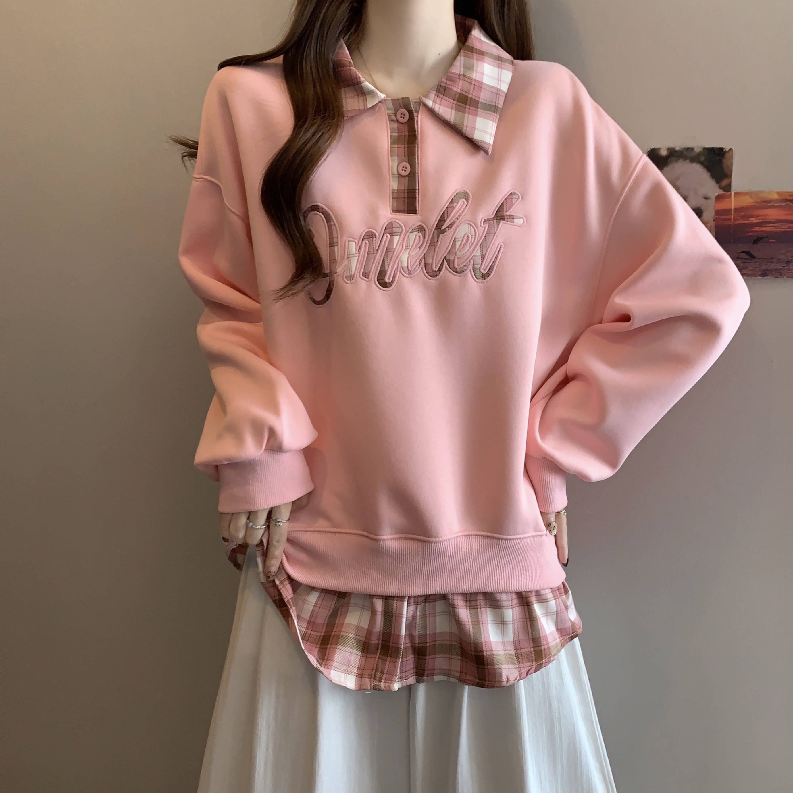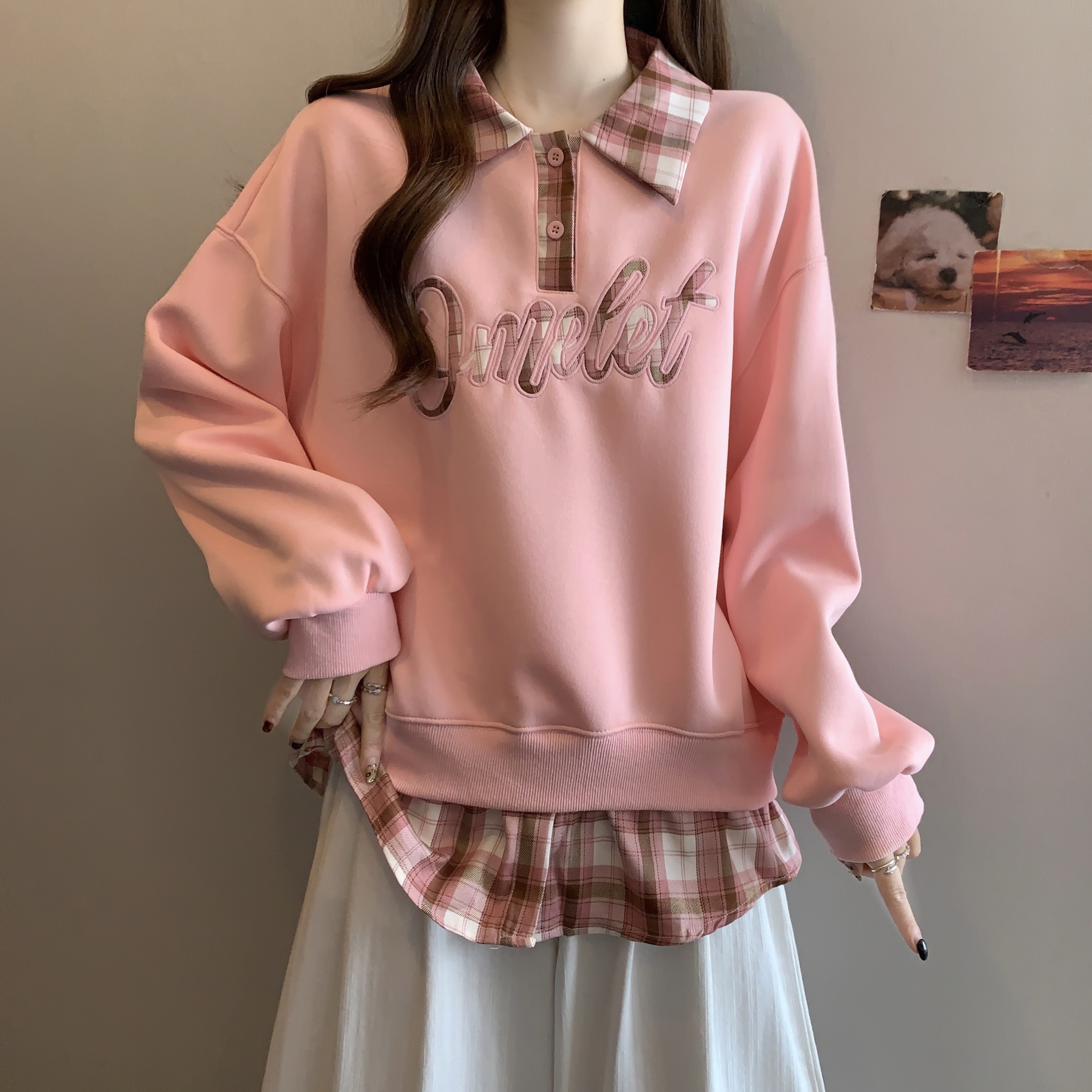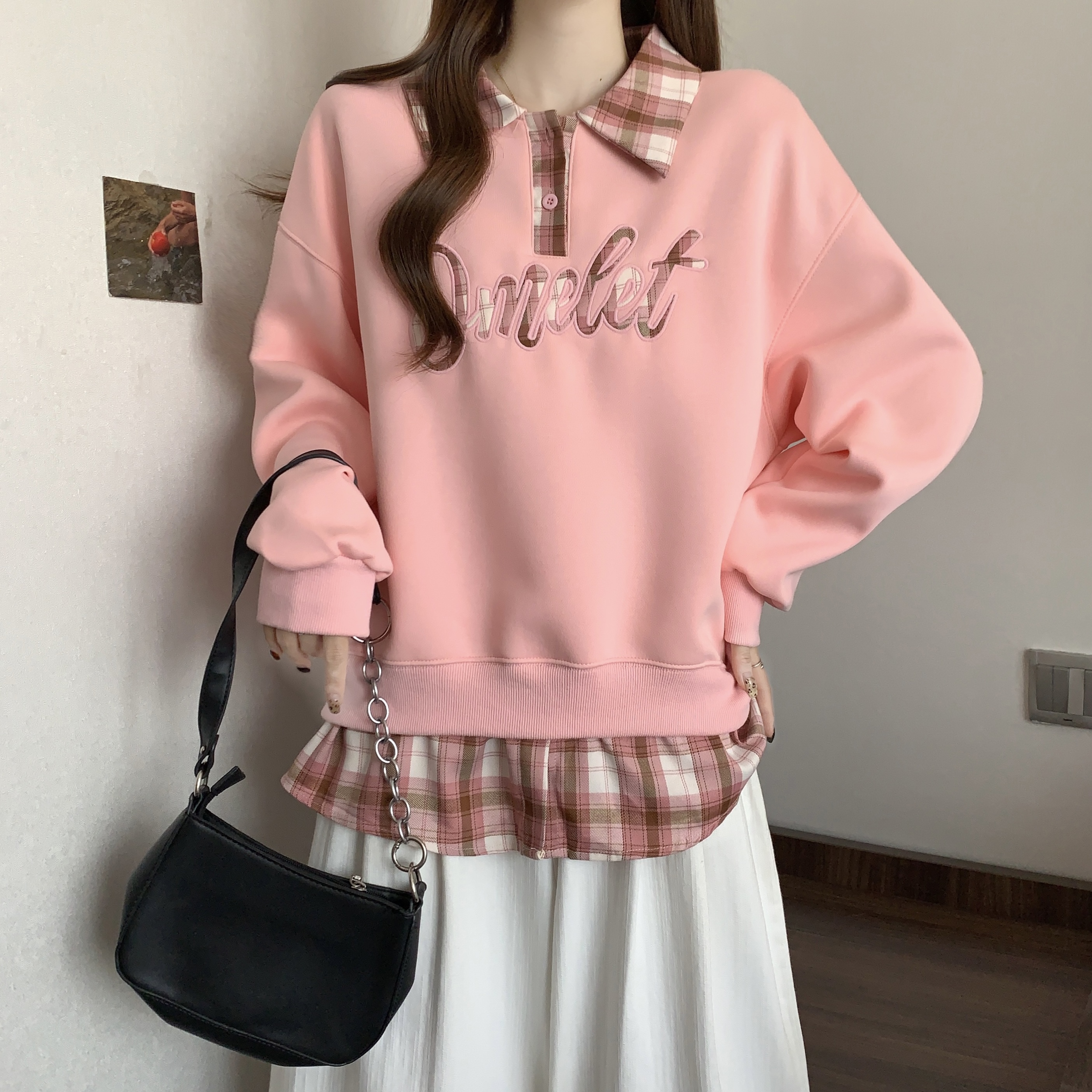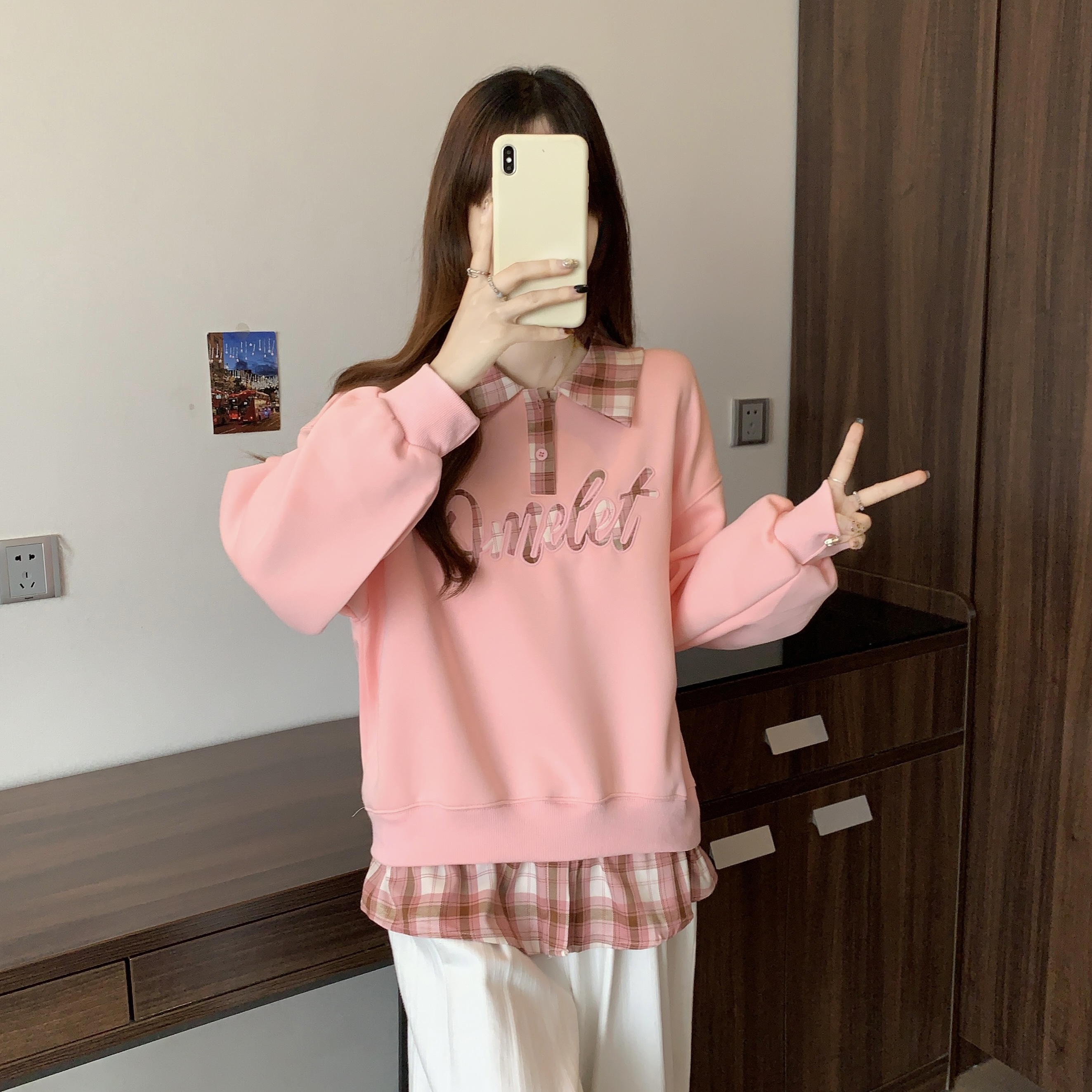 MY14404# 胖MM新款韩系假两件拼接学院风慵懒Polo领套头卫衣女裝貨源服裝批發