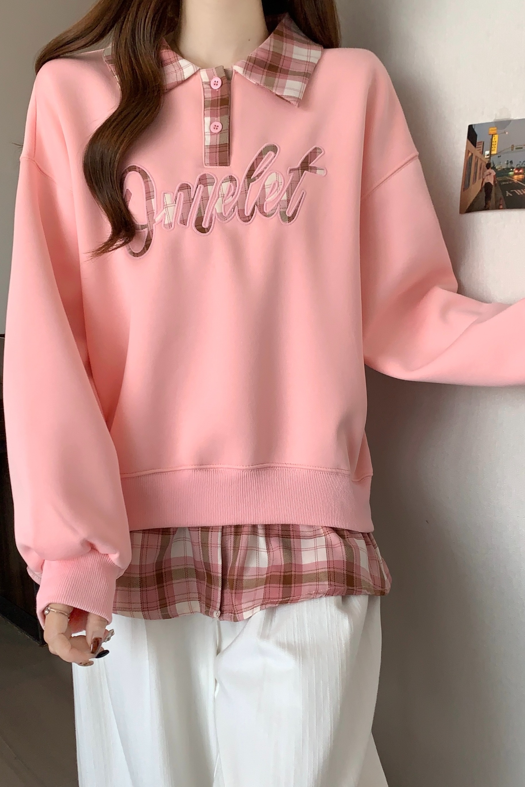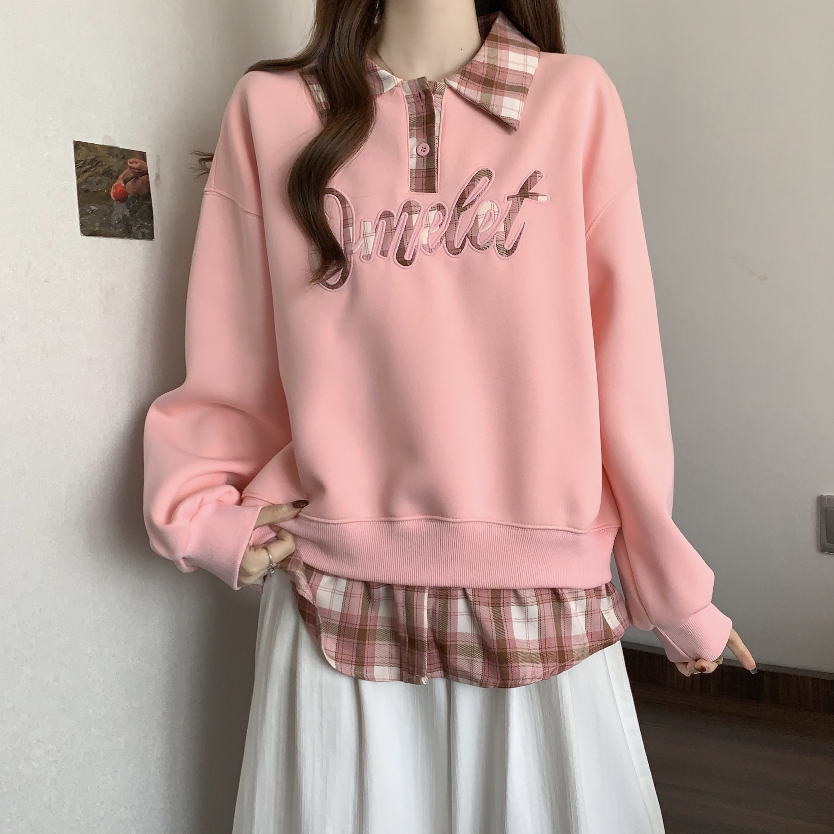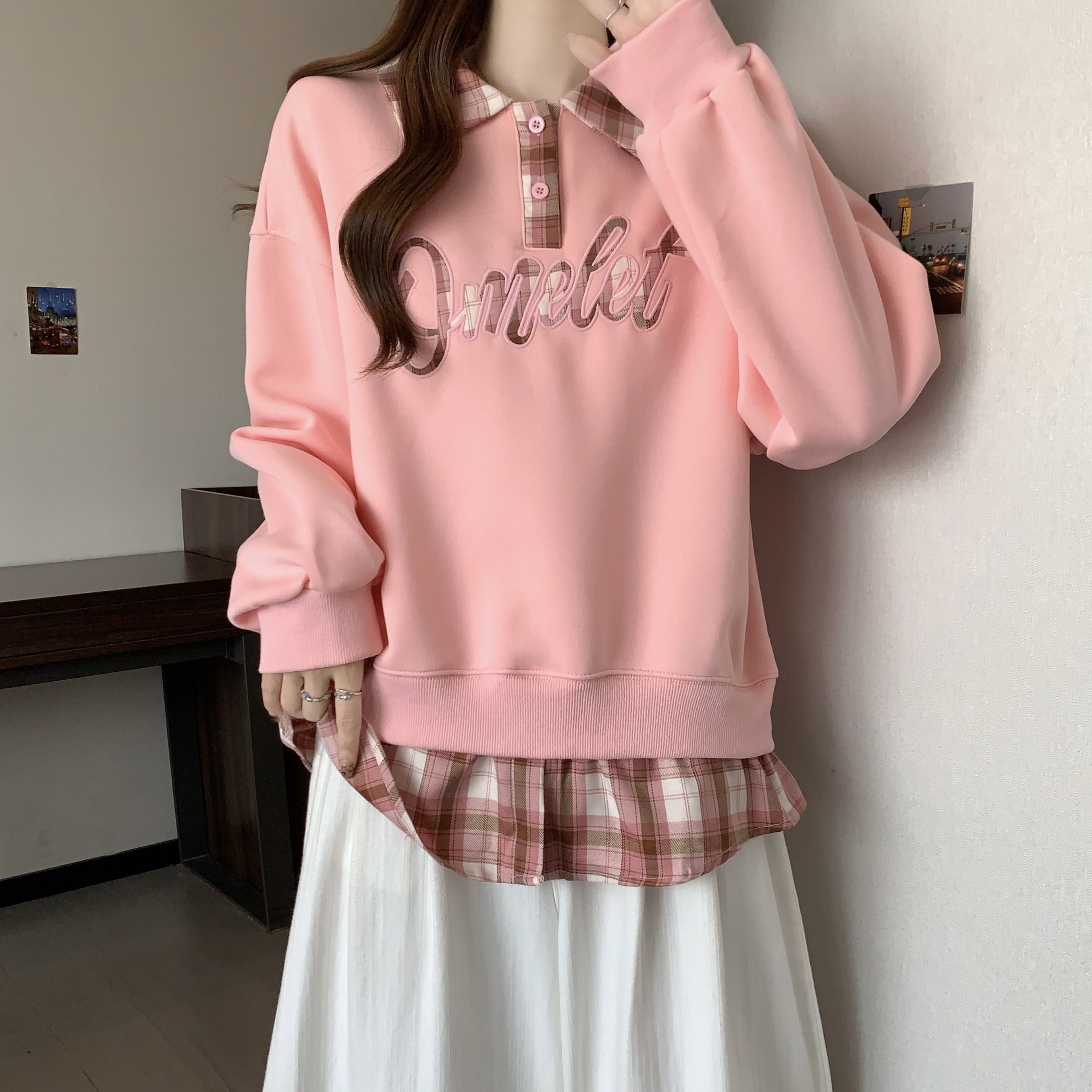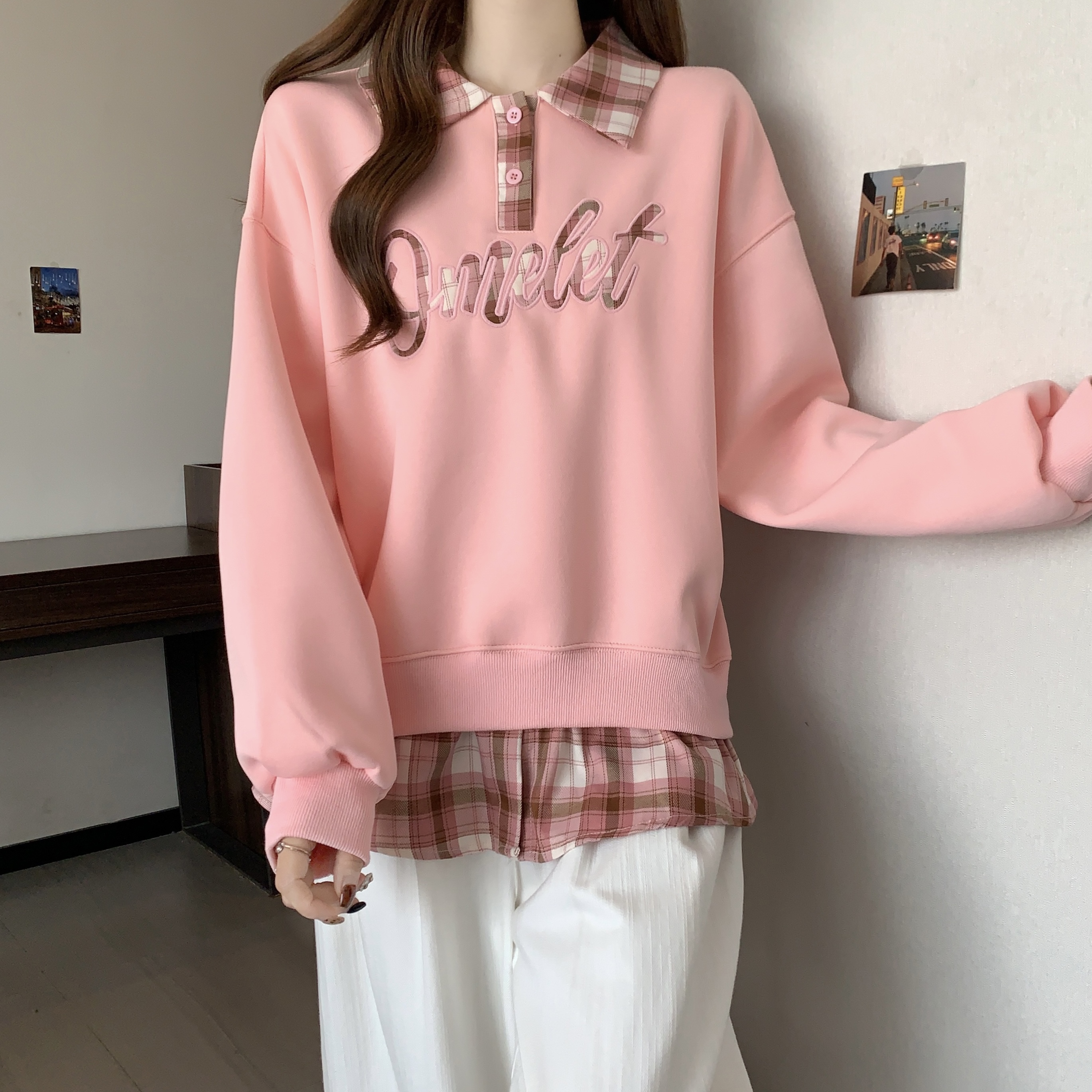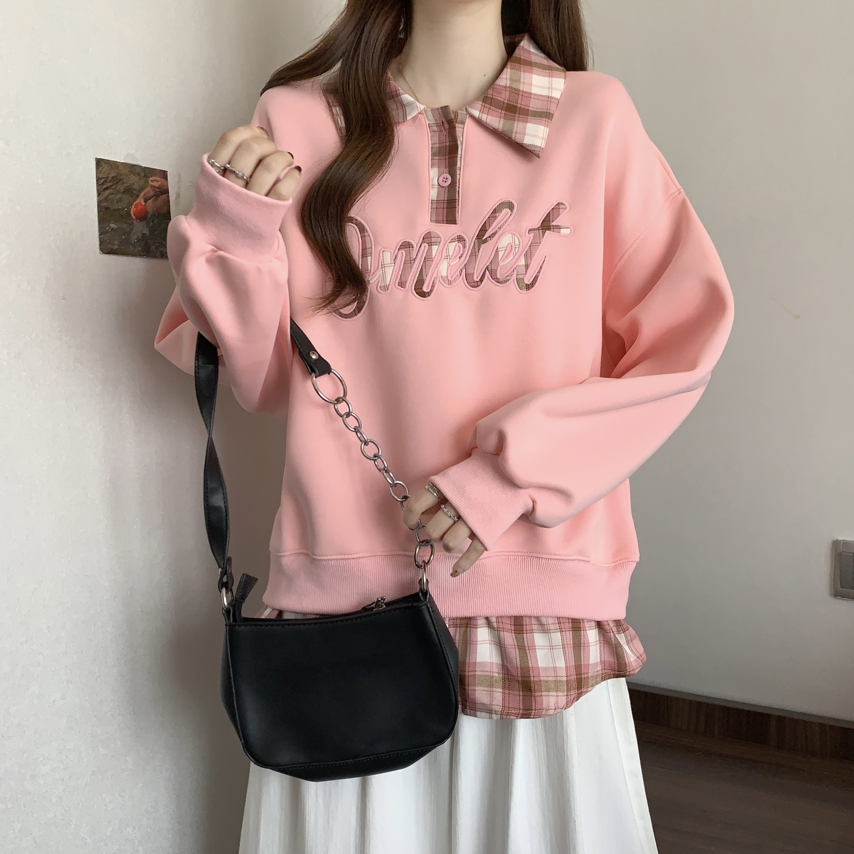 MY14404# 胖MM新款韩系假两件拼接学院风慵懒Polo领套头卫衣女裝貨源服裝批發