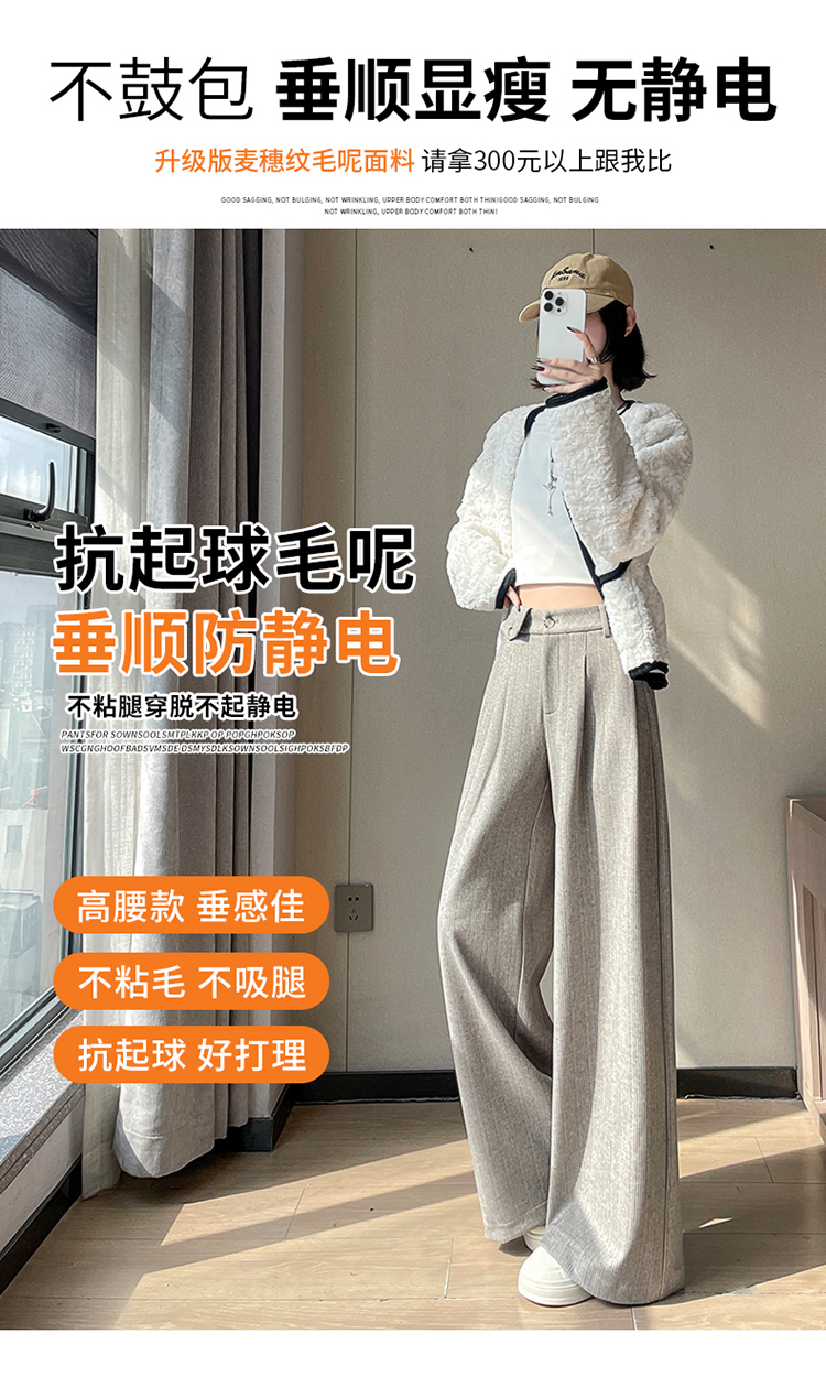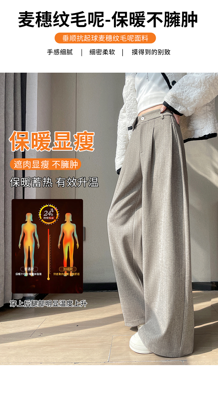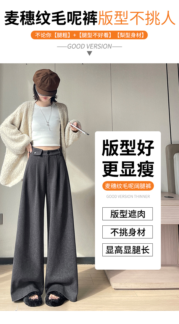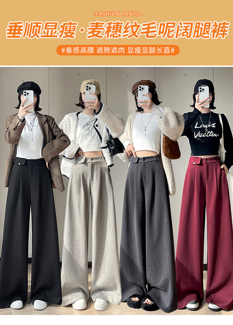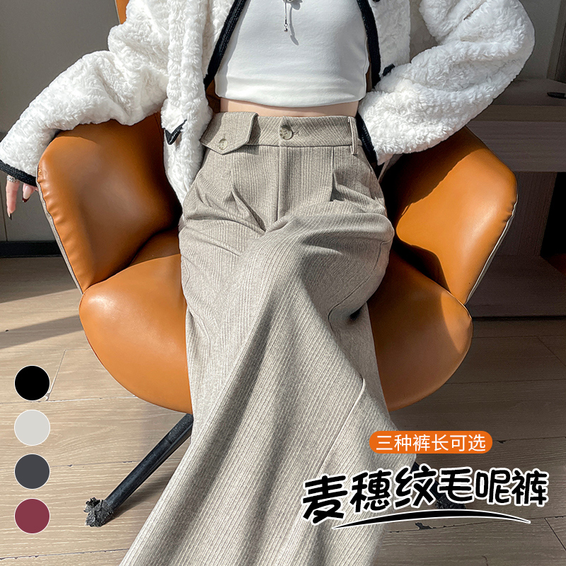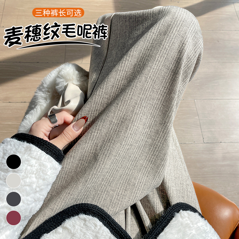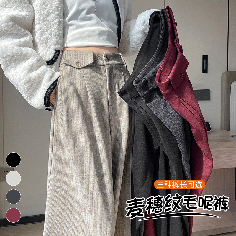 MY14554# 新款加绒麦穗纹毛呢裤直筒阔腿裤高腰拖地休闲裤女女裝貨源服裝批發