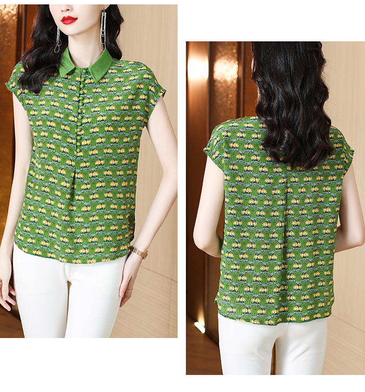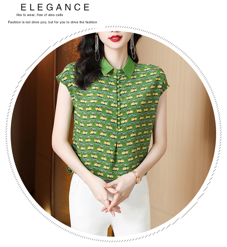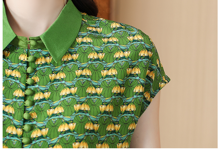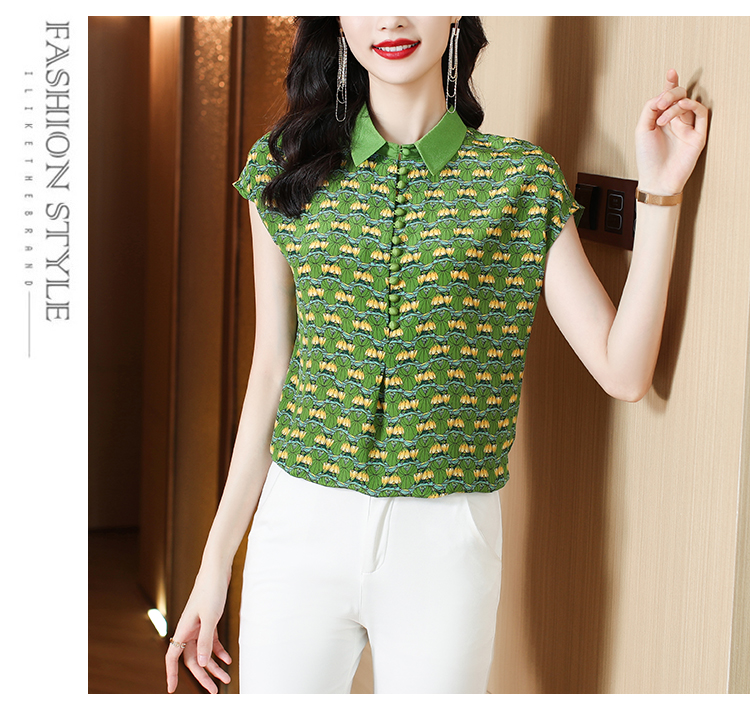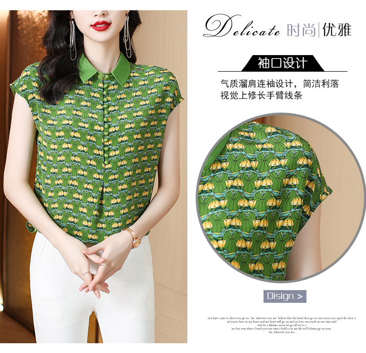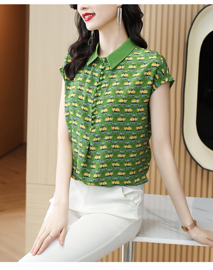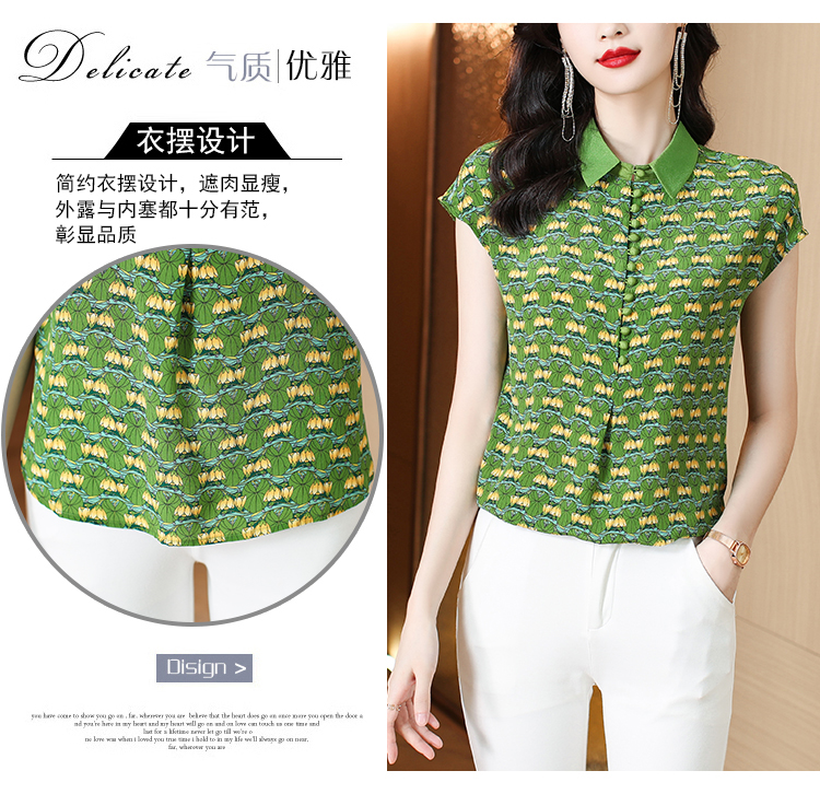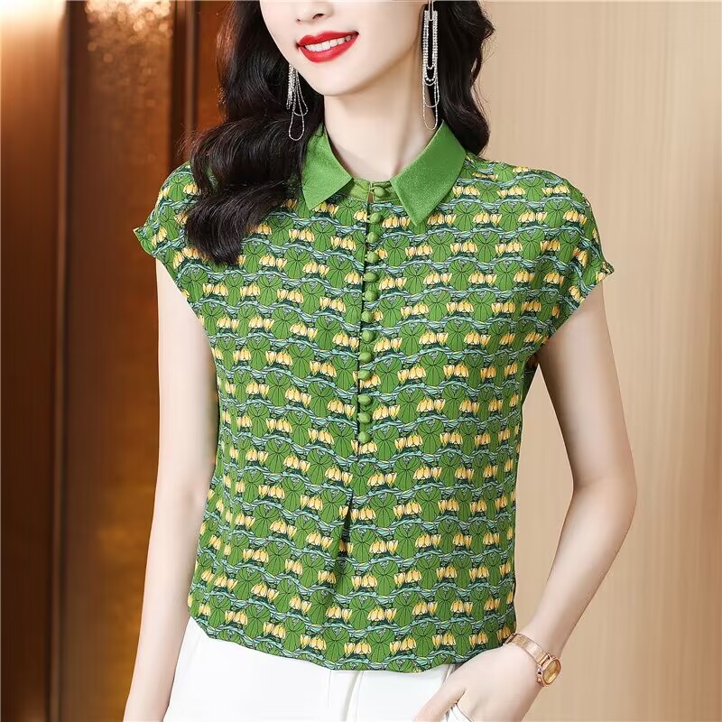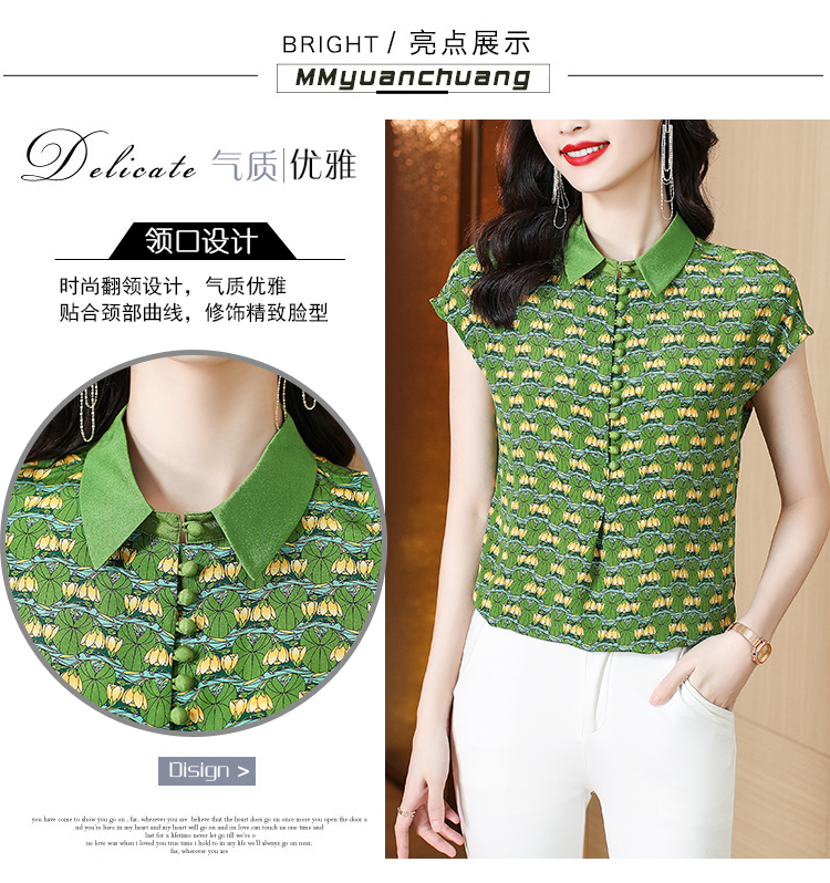 MY14581# 杭州桑蚕丝真丝衬衫女短袖印花夏季上衣时尚显瘦法式女裝貨源服裝批發