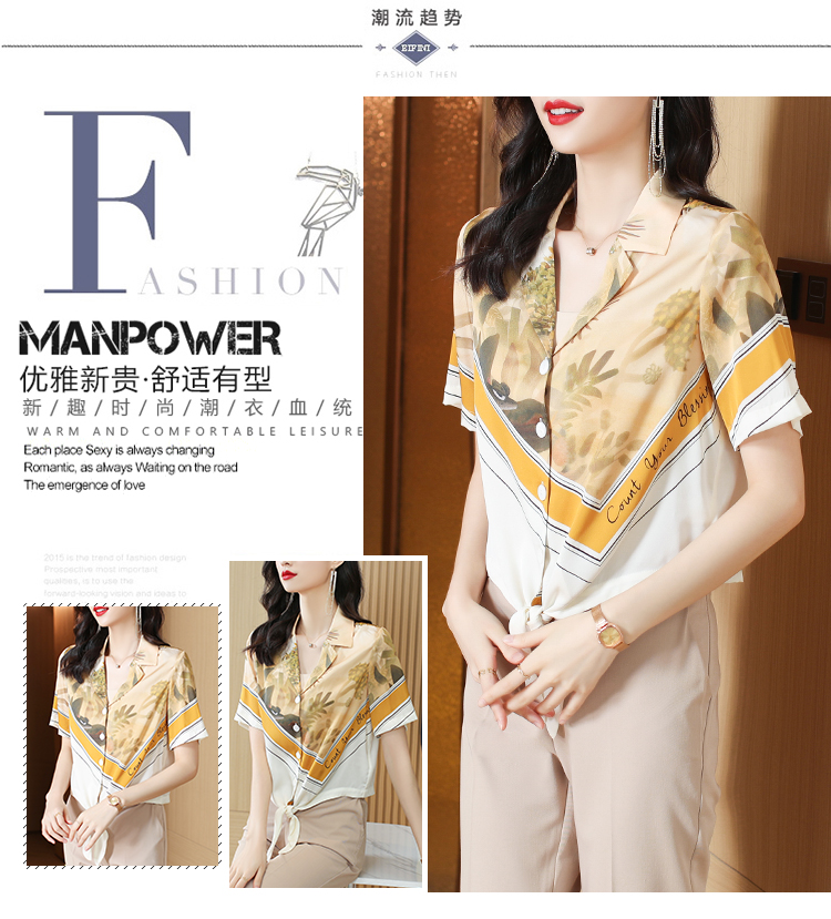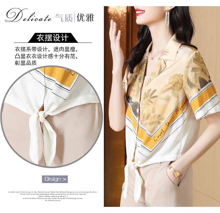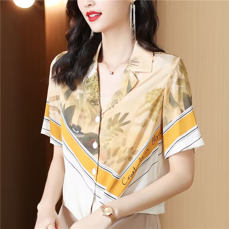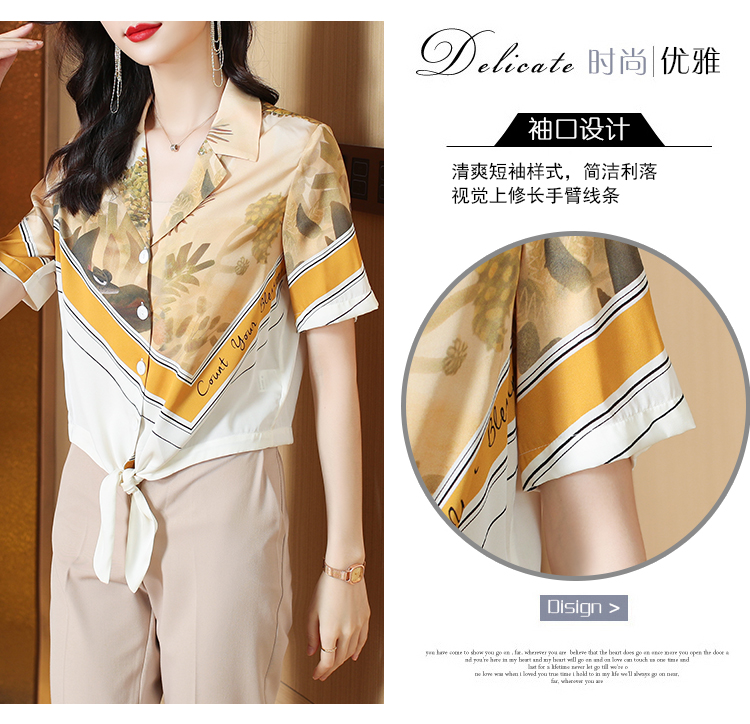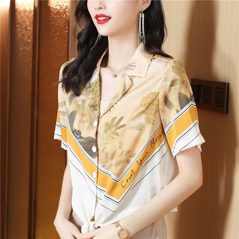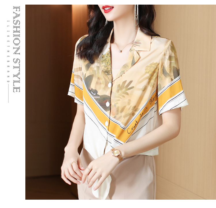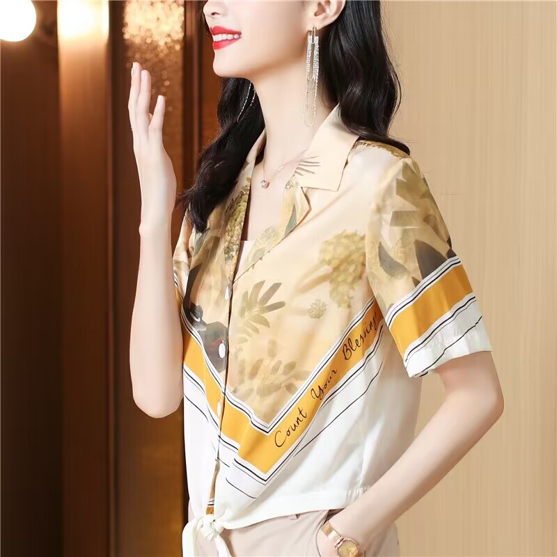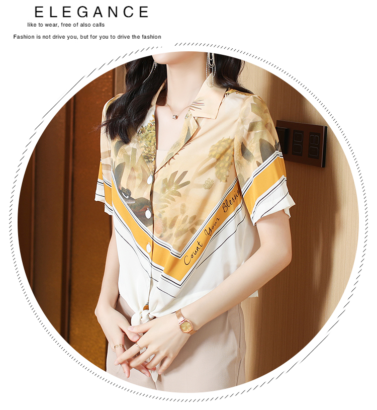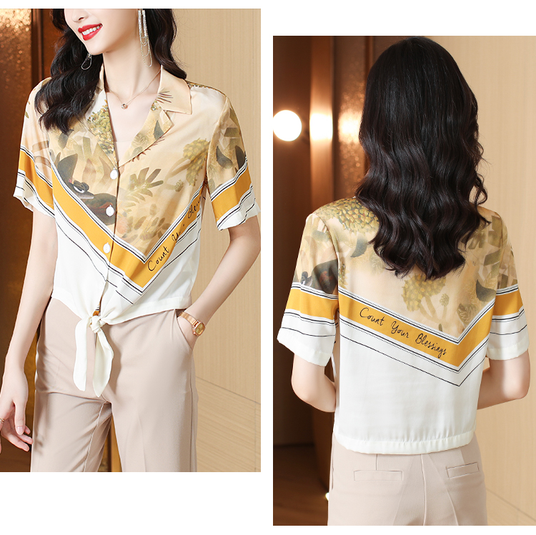 MY14582# 高端重磅真丝衬衫女士夏季新款短袖碎花复古衬衣显瘦别致上衣女裝貨源服裝批發
