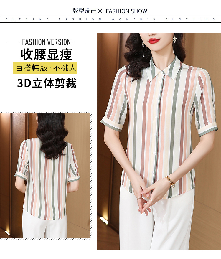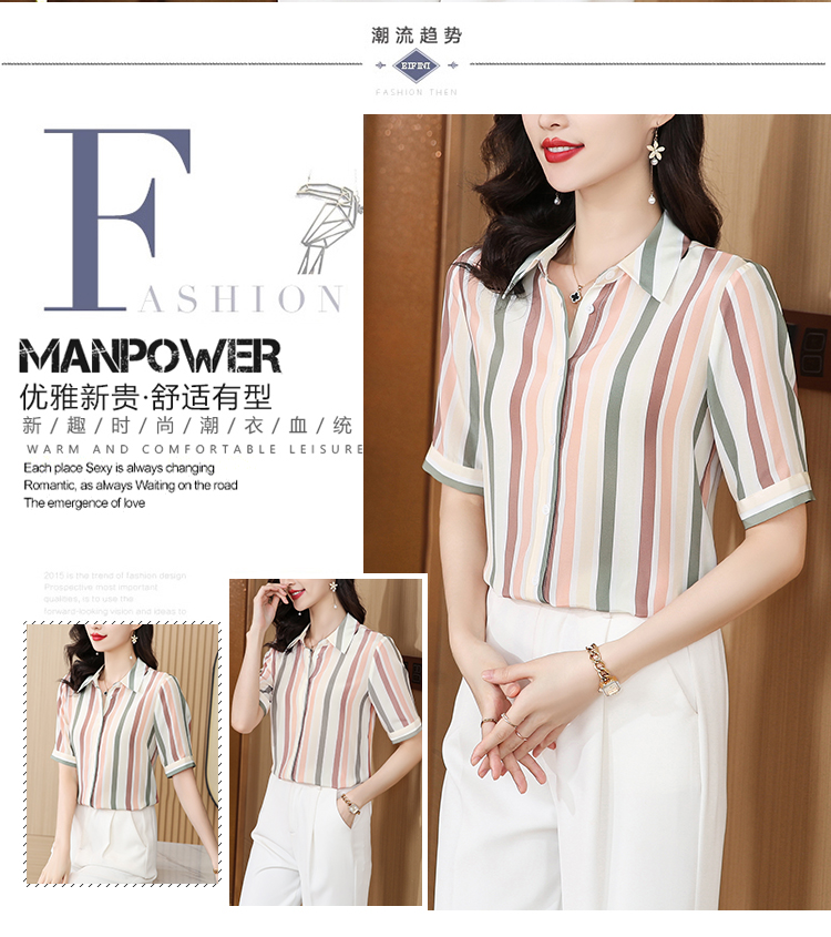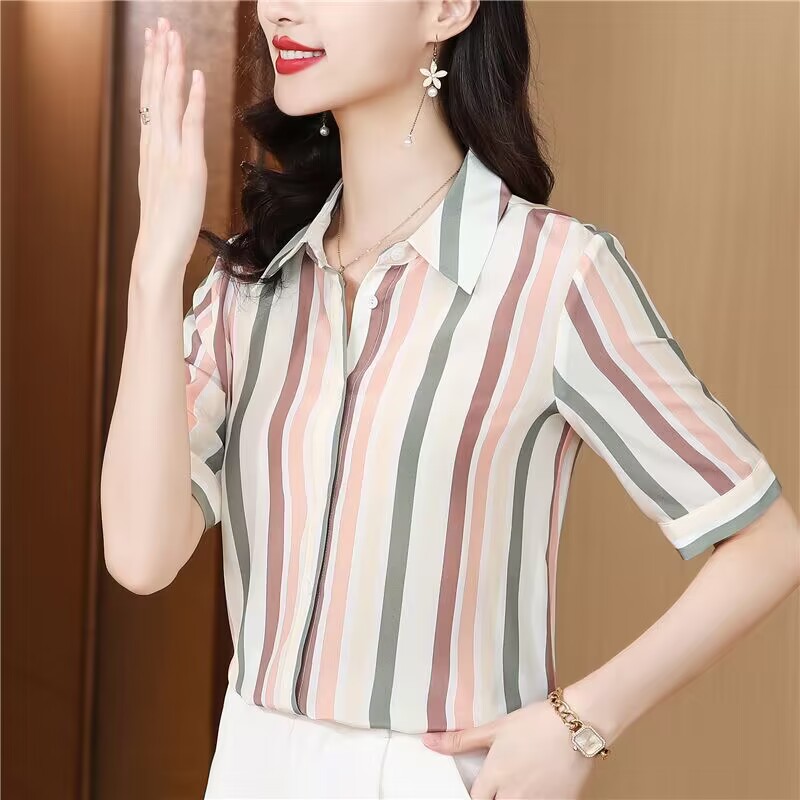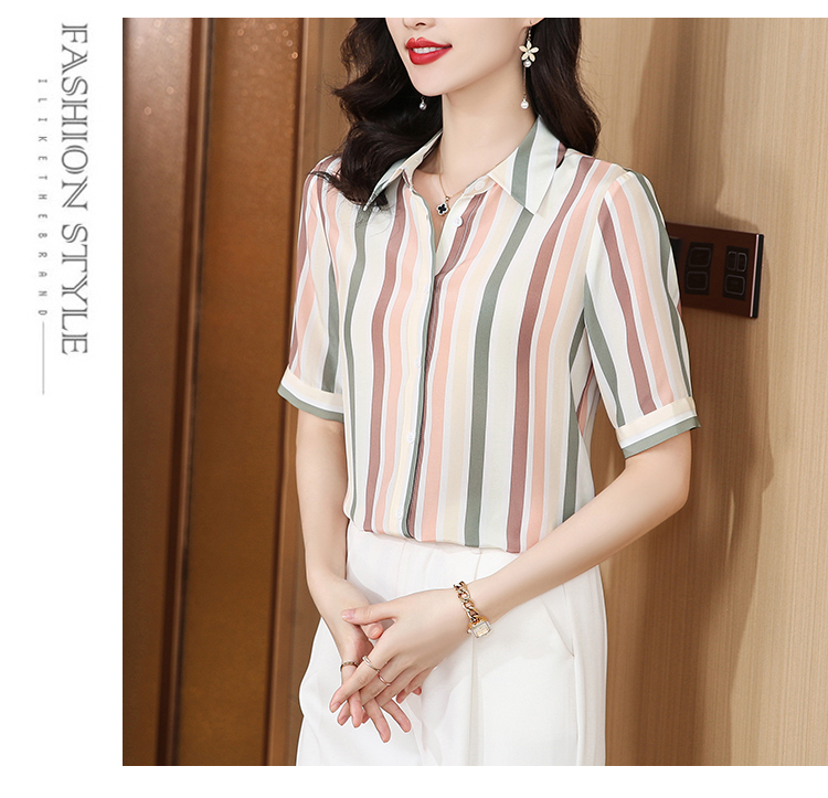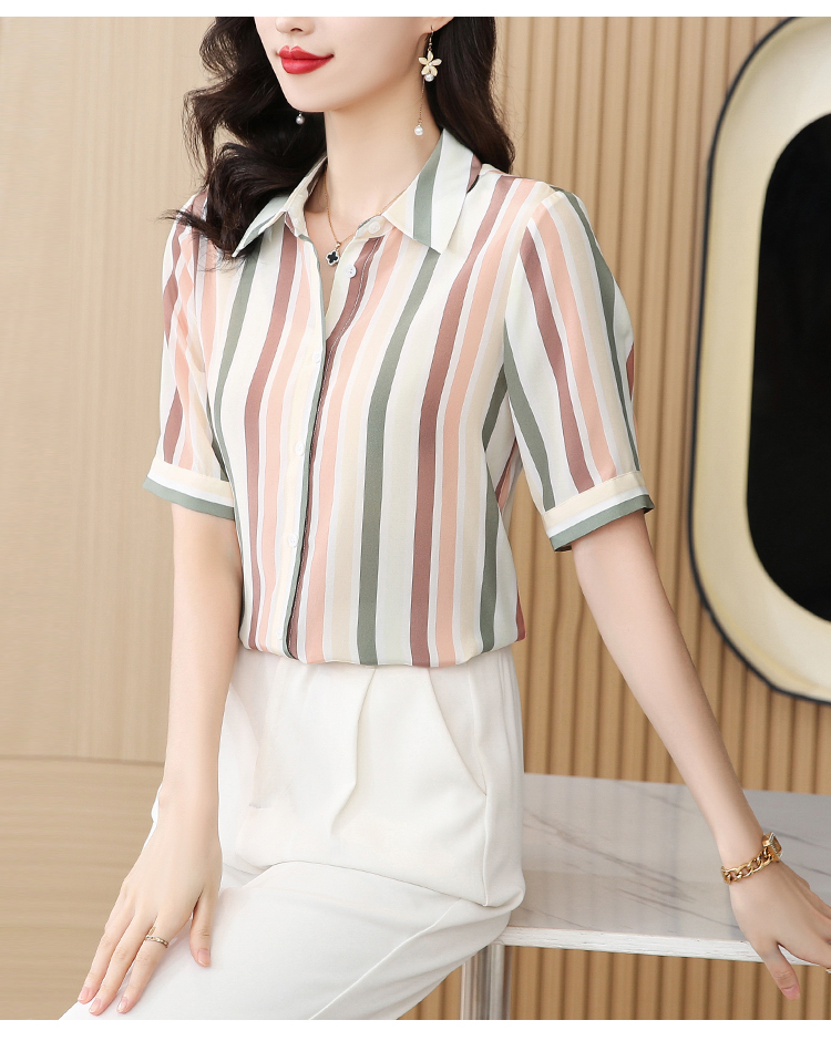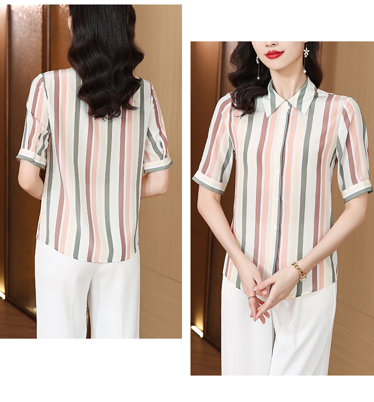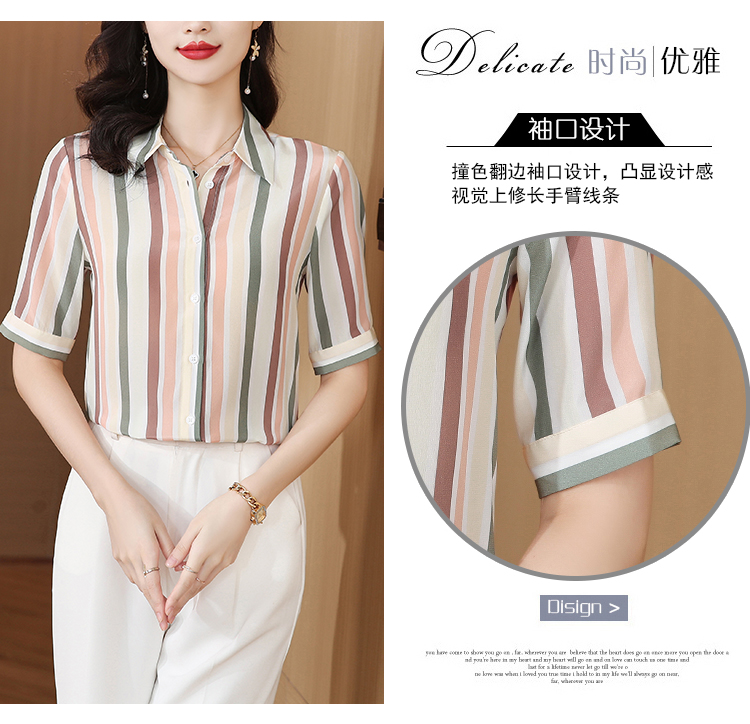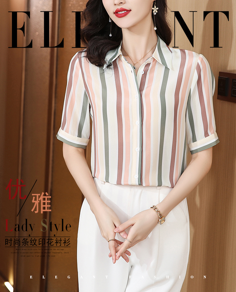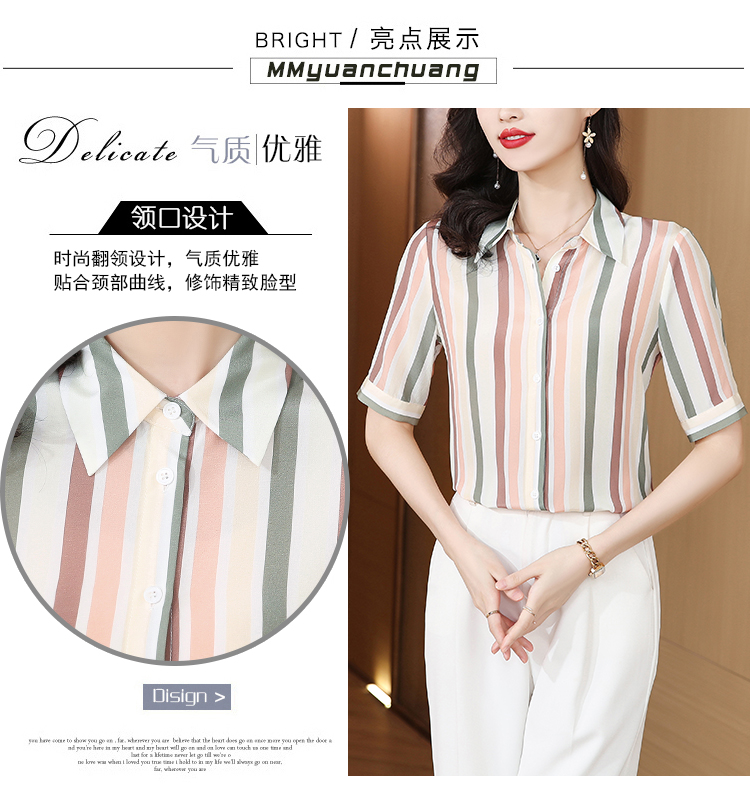 MY14583# 彩色条纹短袖双绉真丝衬衫新款气质翻领休闲显瘦桑蚕丝上衣女裝貨源服裝批發