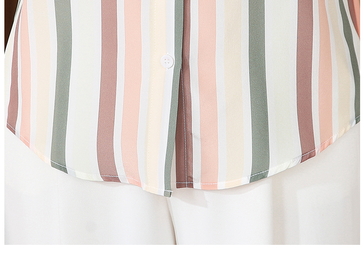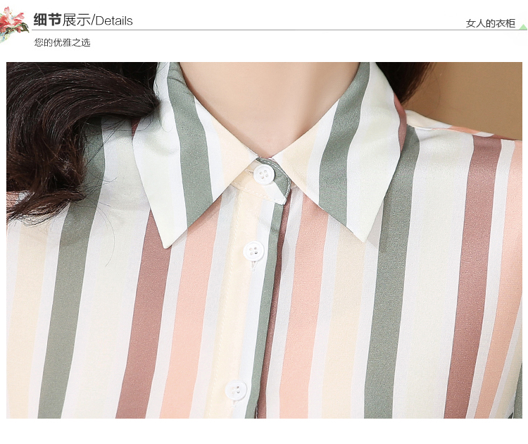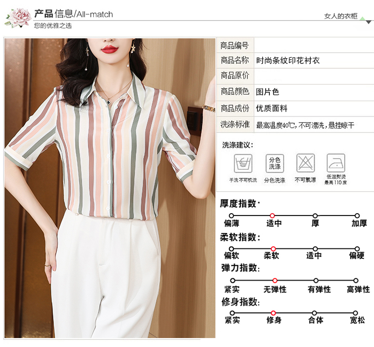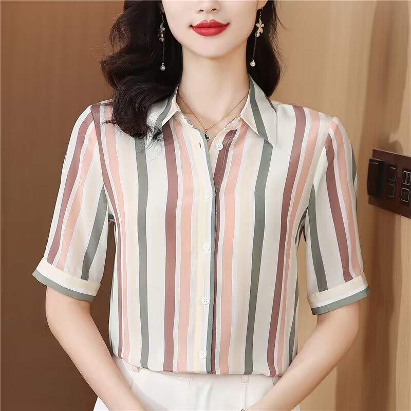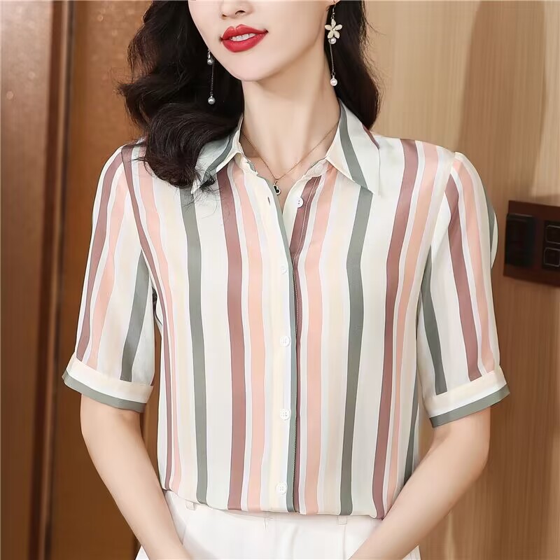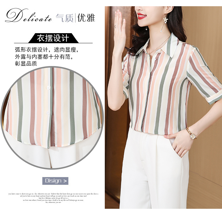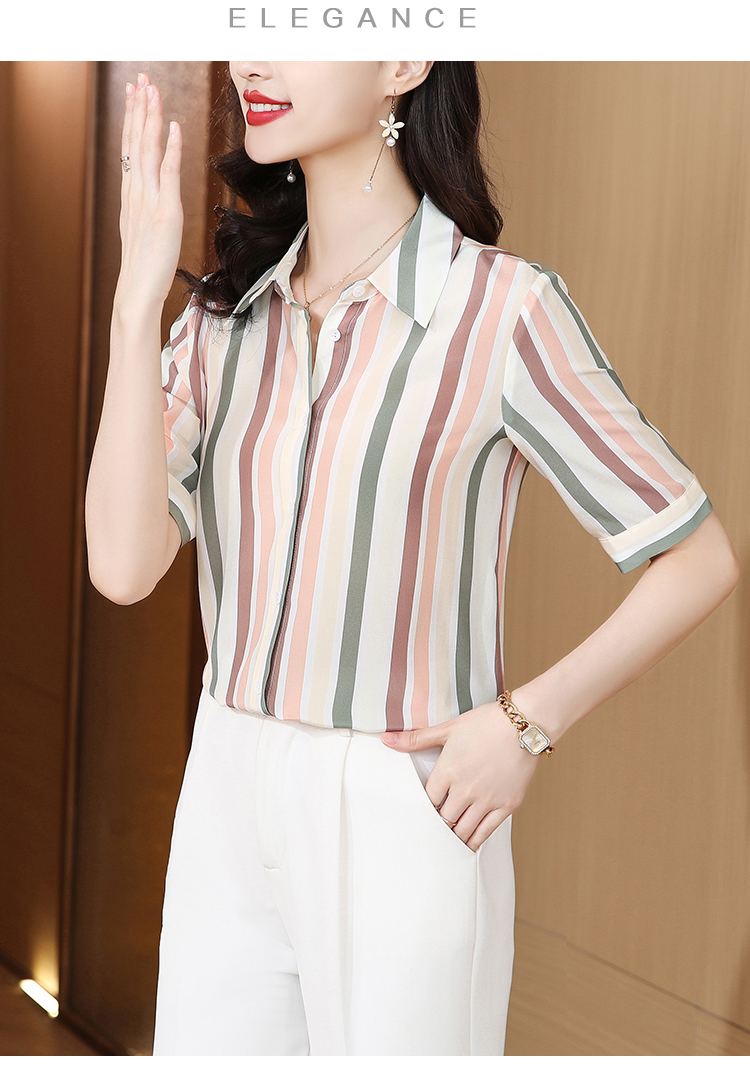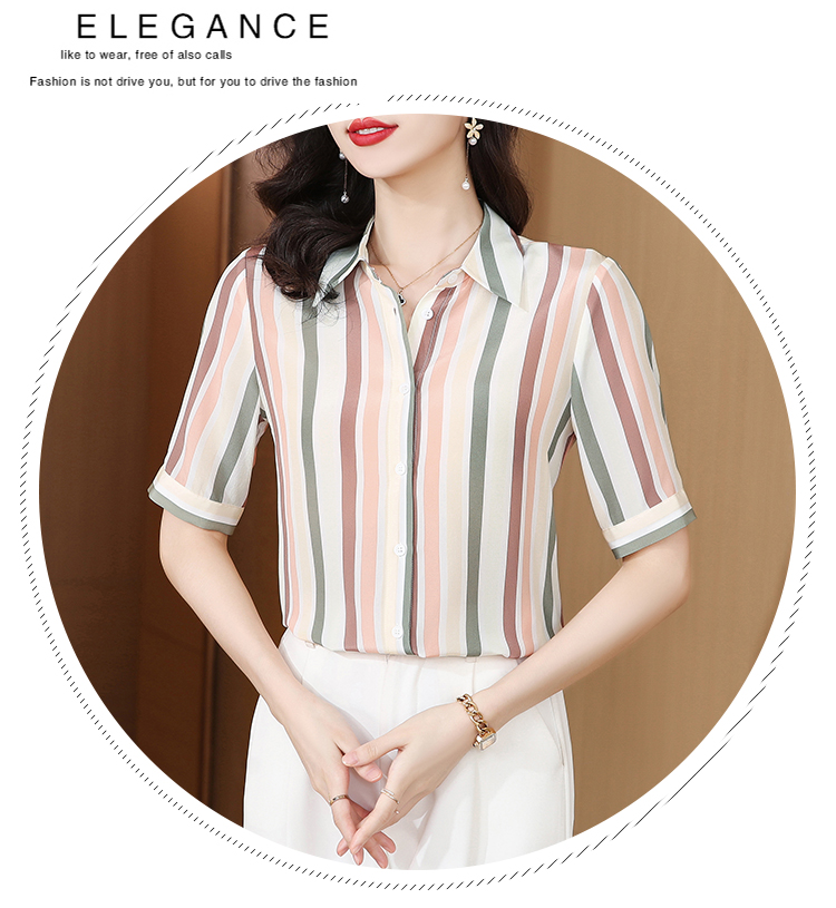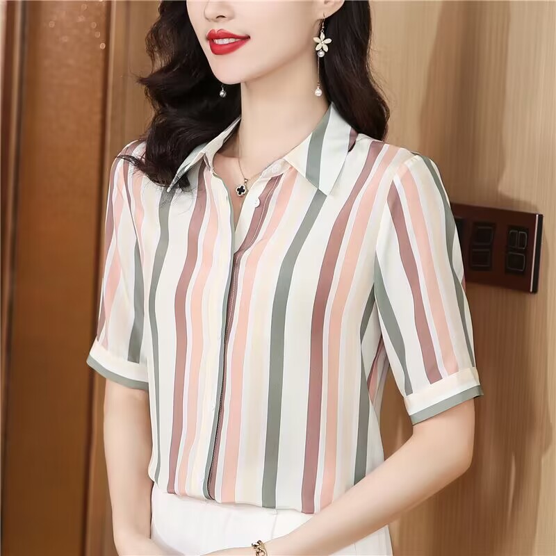 MY14583# 彩色条纹短袖双绉真丝衬衫新款气质翻领休闲显瘦桑蚕丝上衣女裝貨源服裝批發