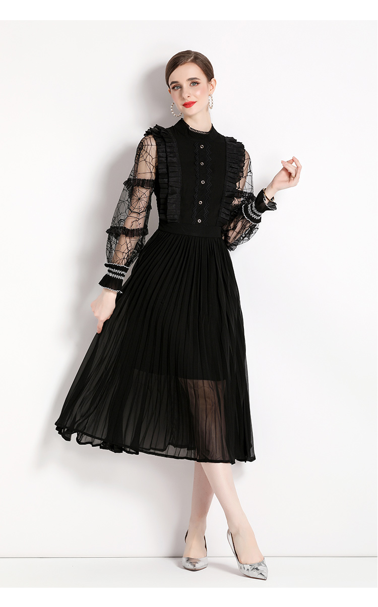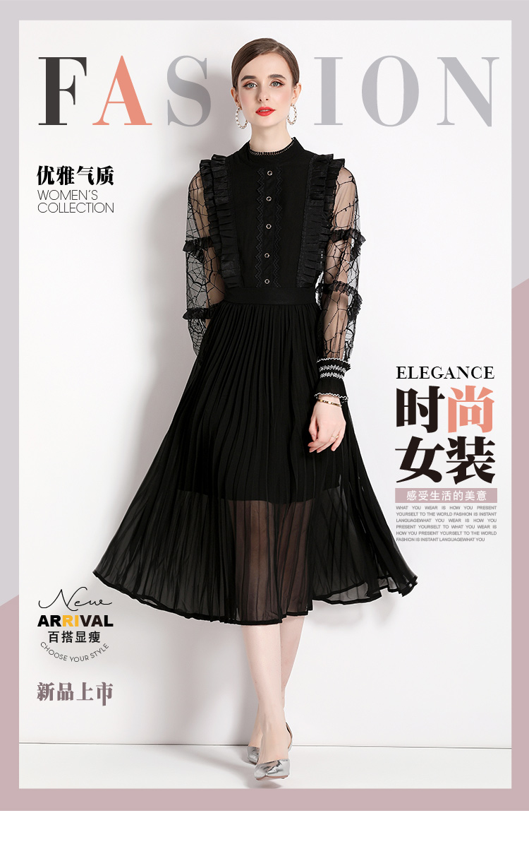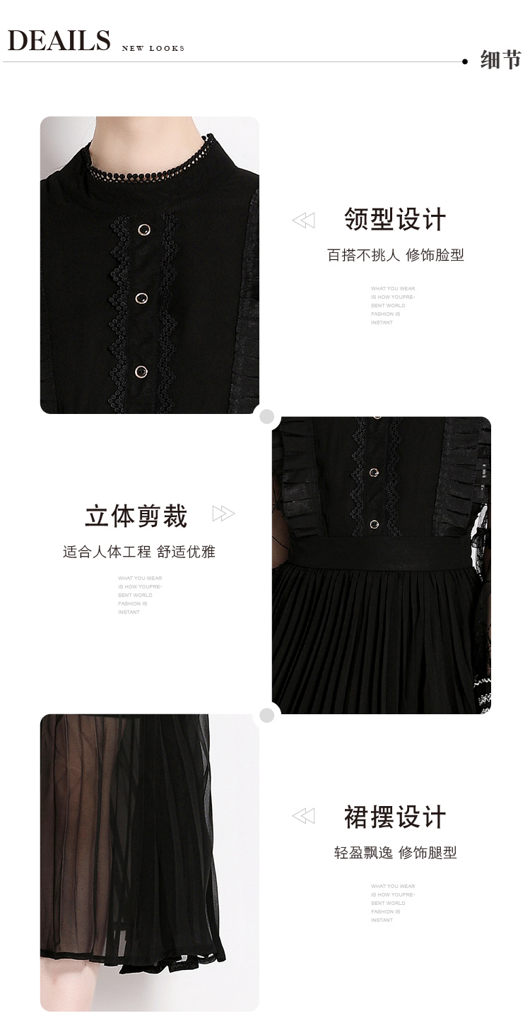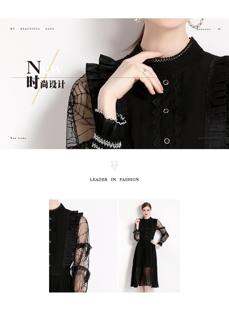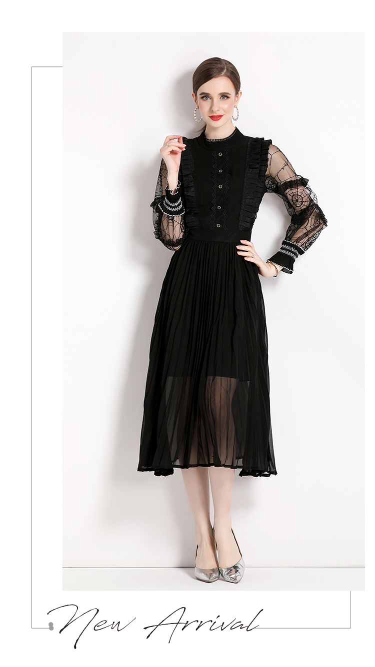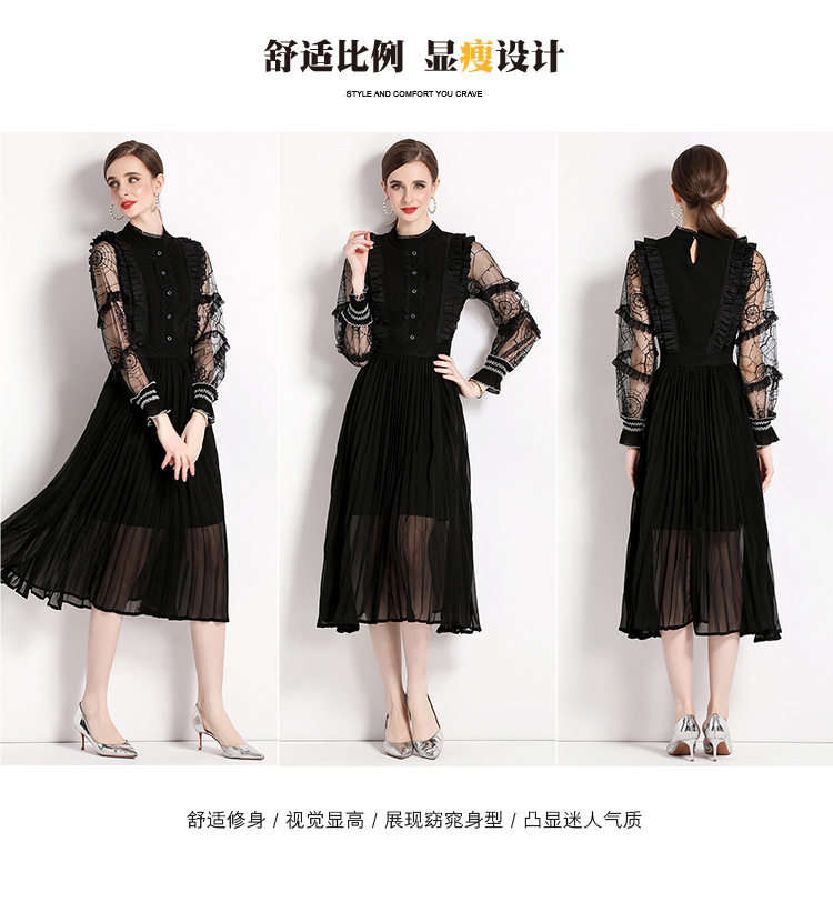 RM4951#新款黑色立领中长款气质收腰大摆连衣裙