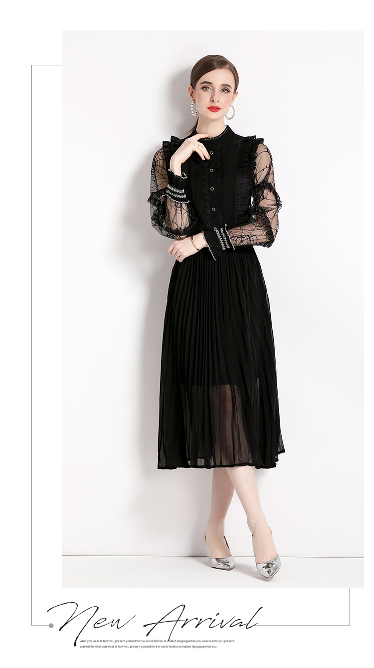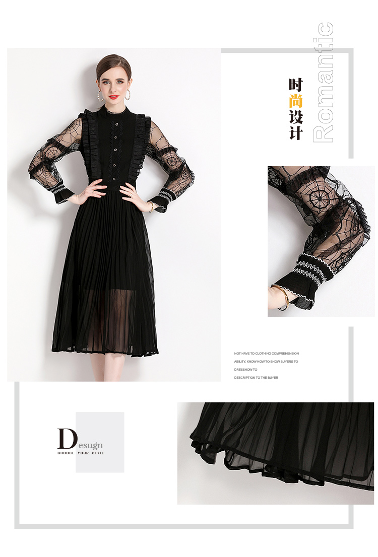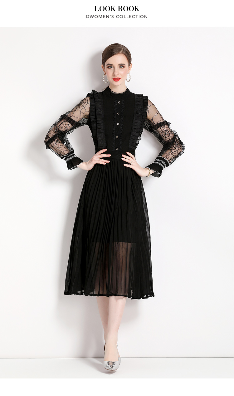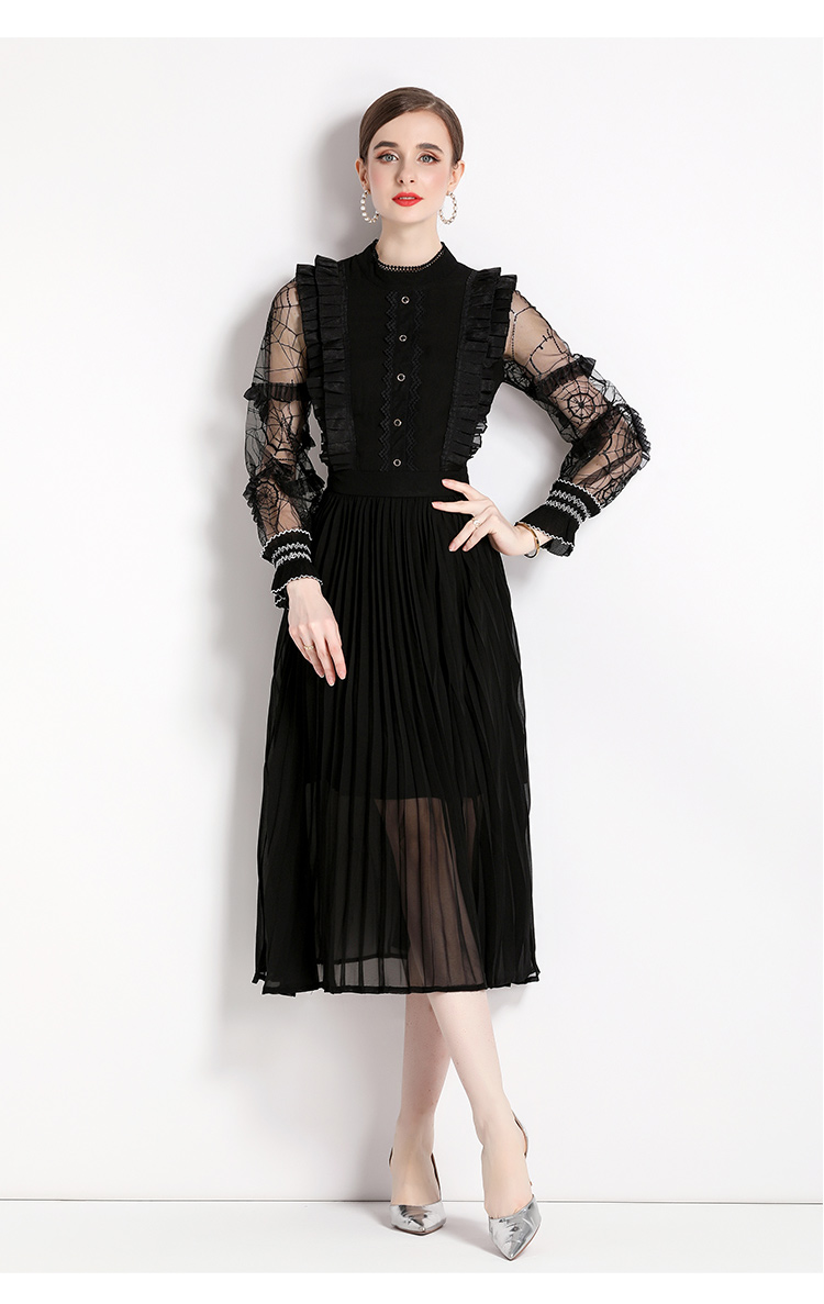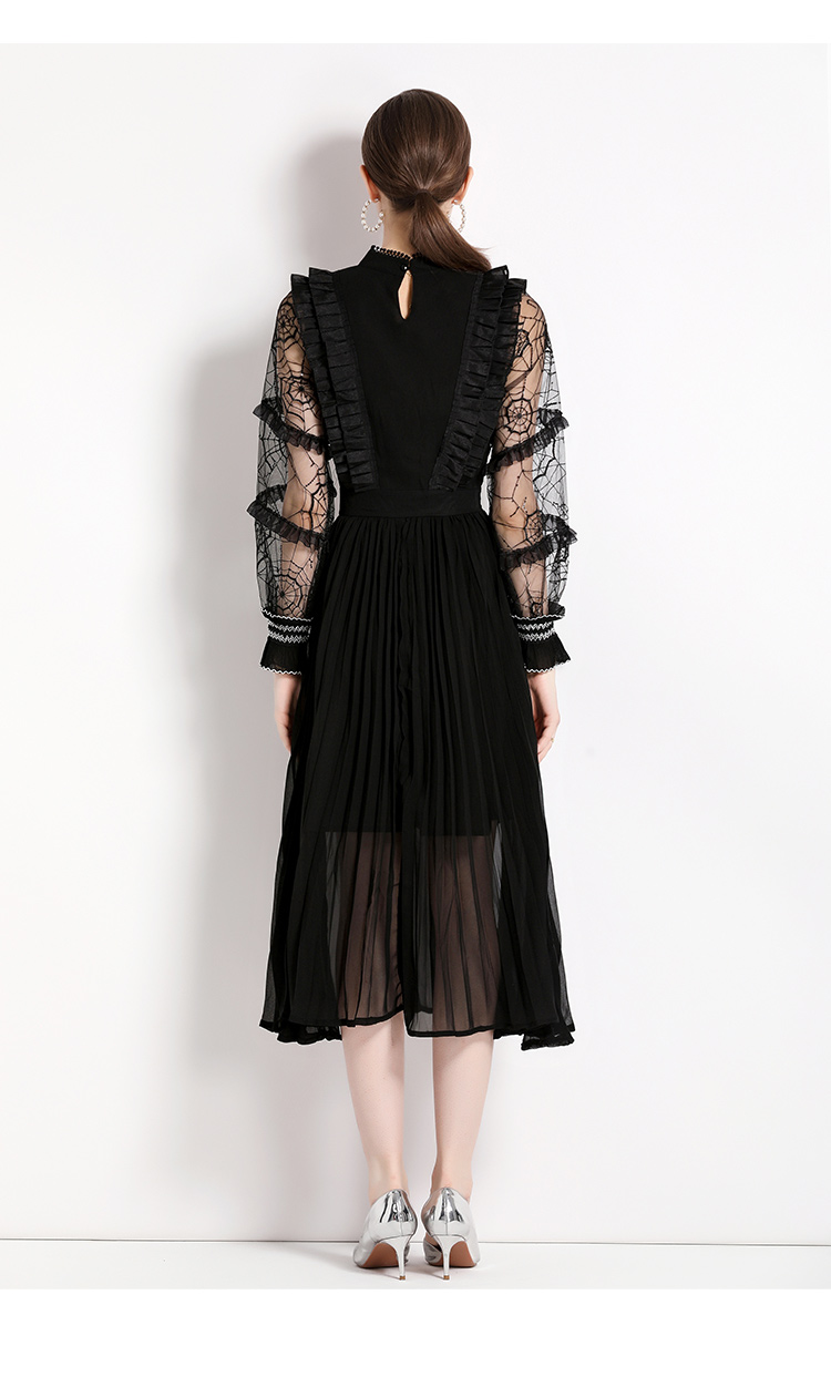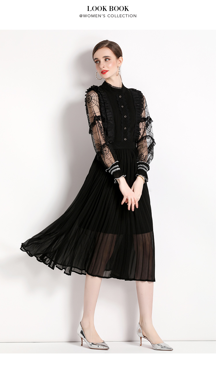 RM4951#新款黑色立领中长款气质收腰大摆连衣裙