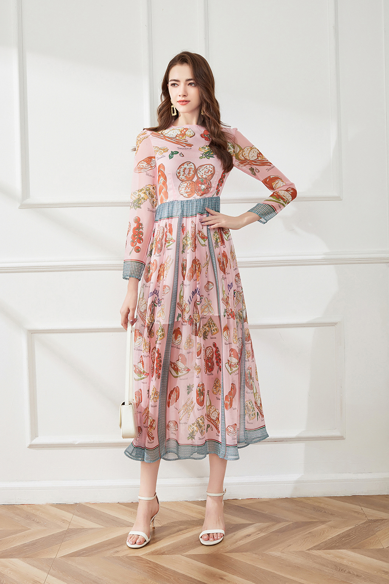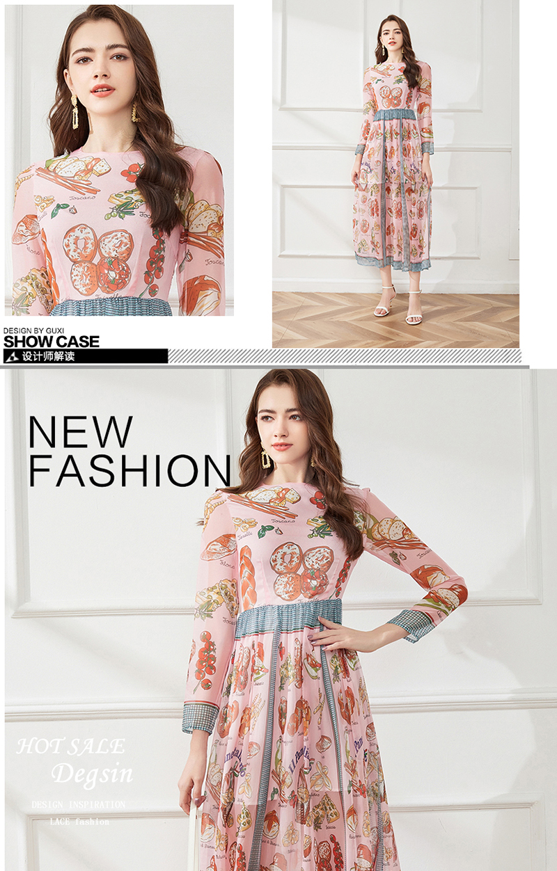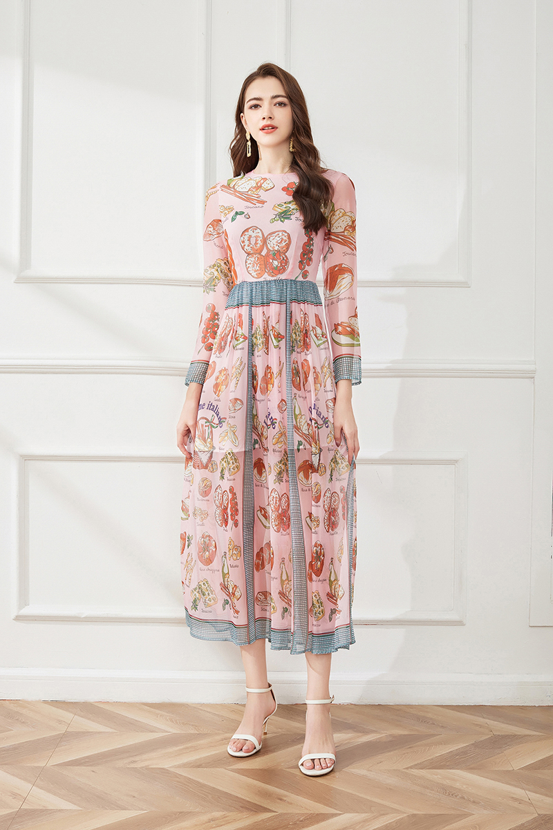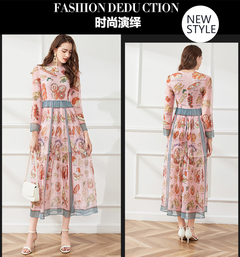 RM4958#春夏轻薄仿真丝雪纺印花连衣裙 圆领大摆大摆A字裙