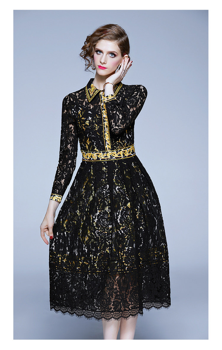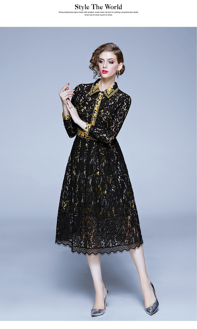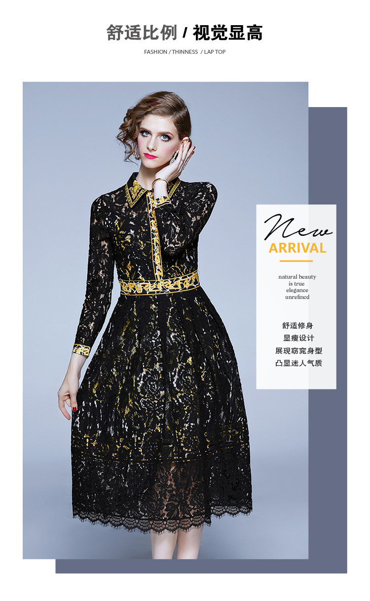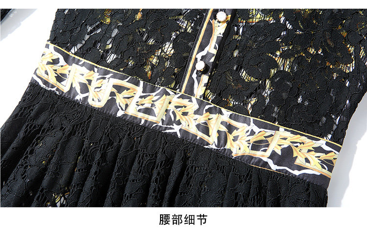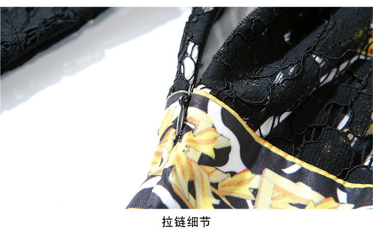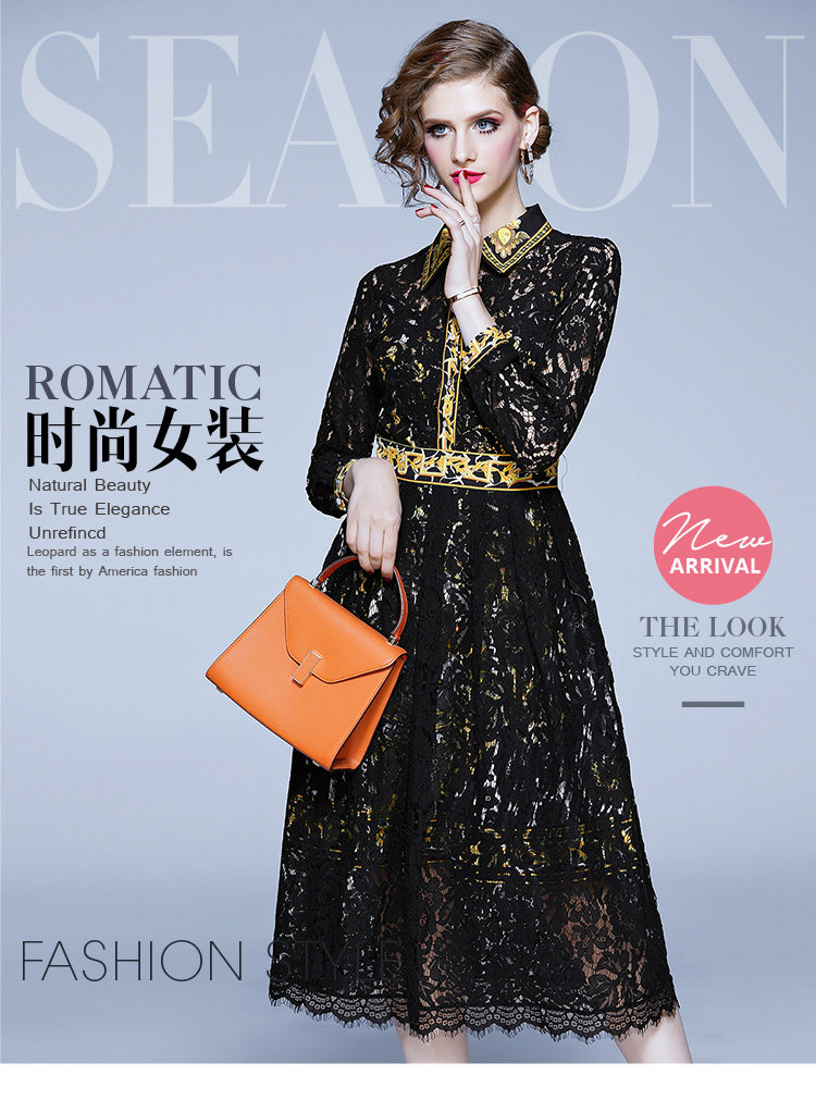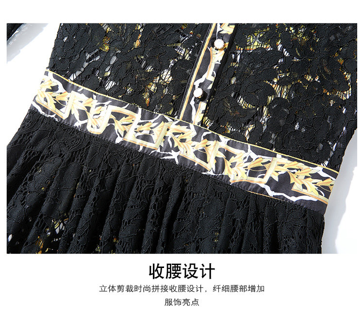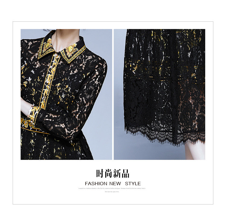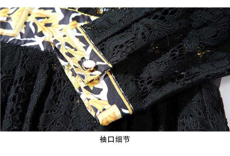 RM4972#新款翻领印花拼接 蕾丝中长款连衣裙