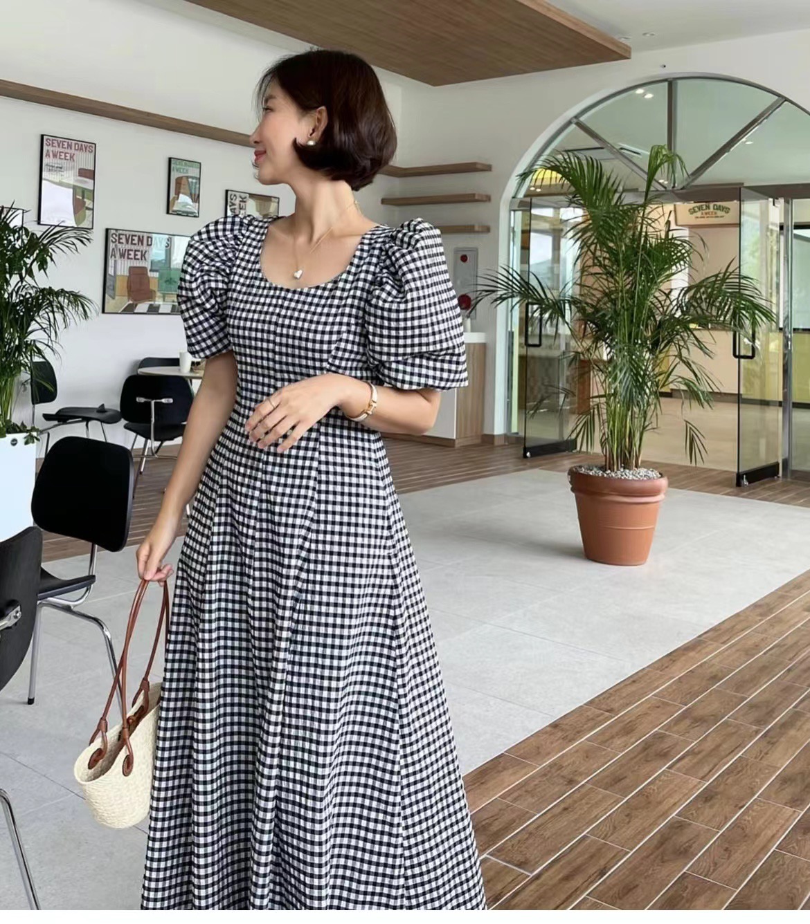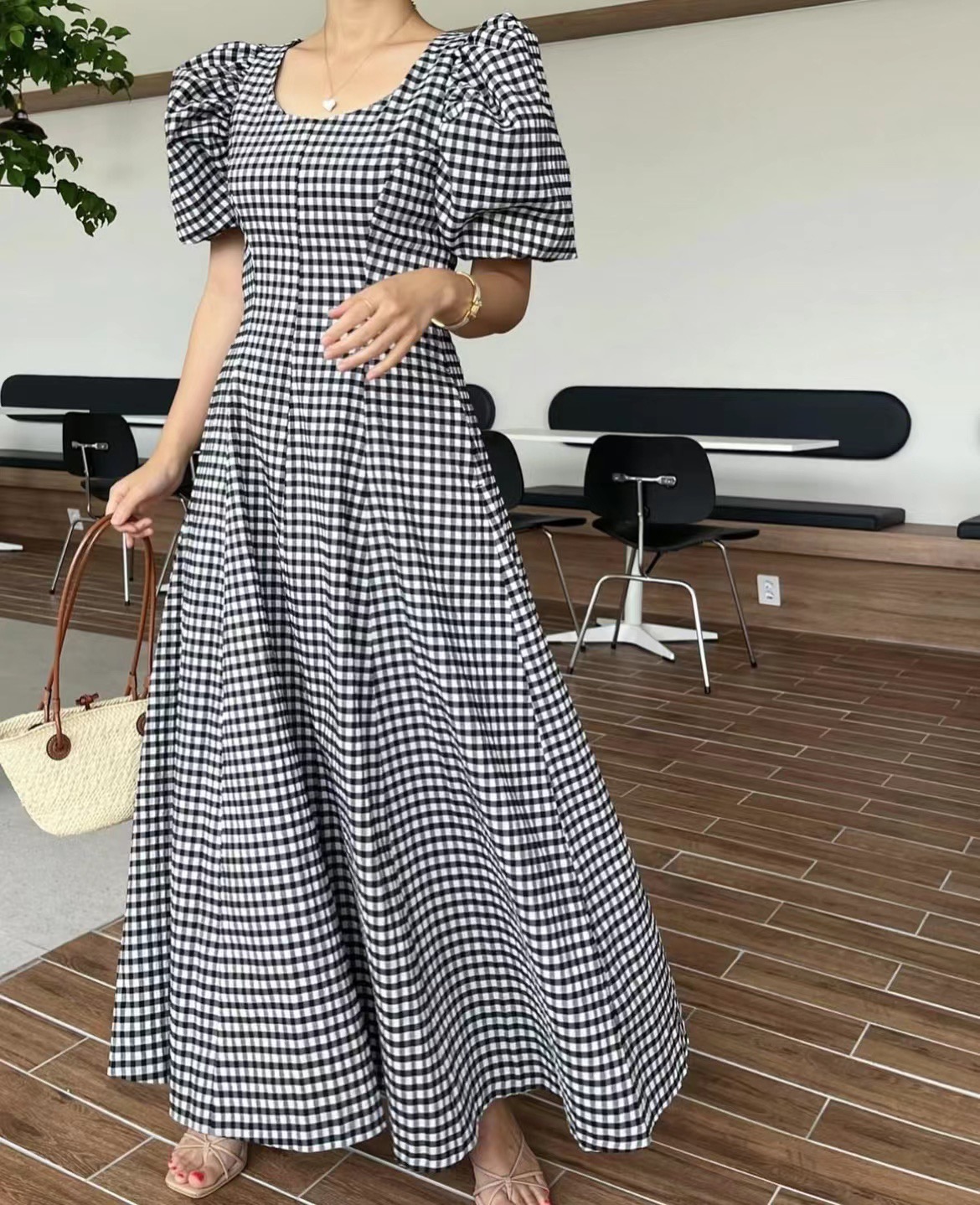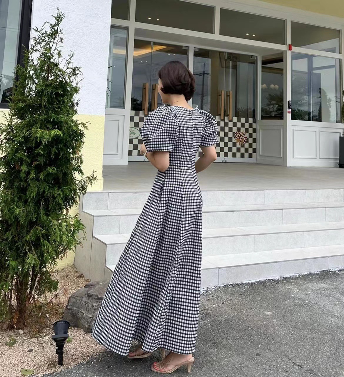 RM5271#韩国chic法式方领泡泡袖甜美风格纹显瘦修身度假长款连衣裙
