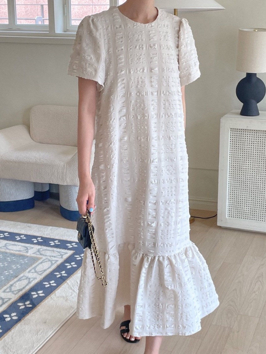 RM5272#韩国chic法式甜美圆领立体褶皱泡泡棉宽松短袖荷叶边鱼尾连衣裙女