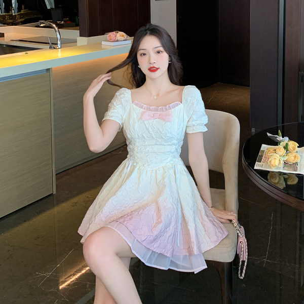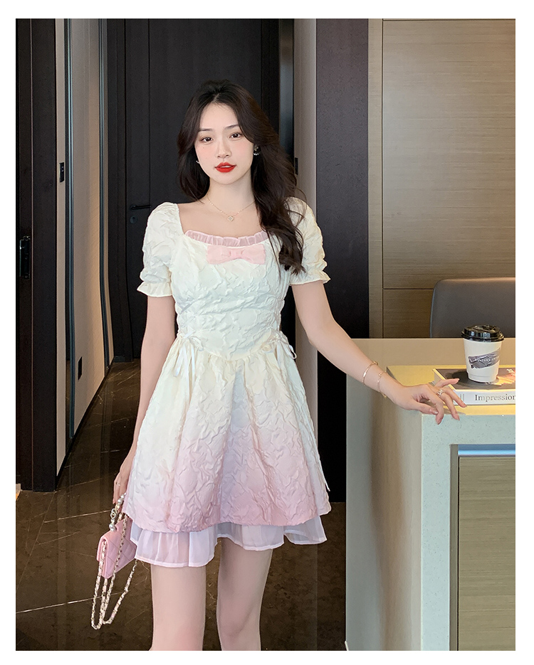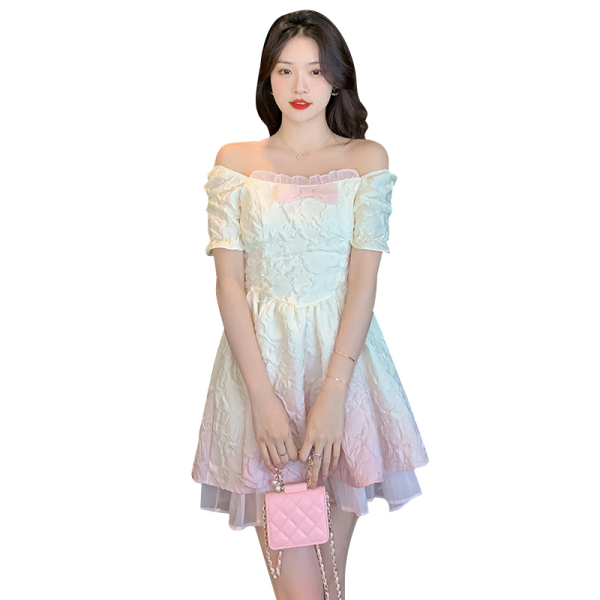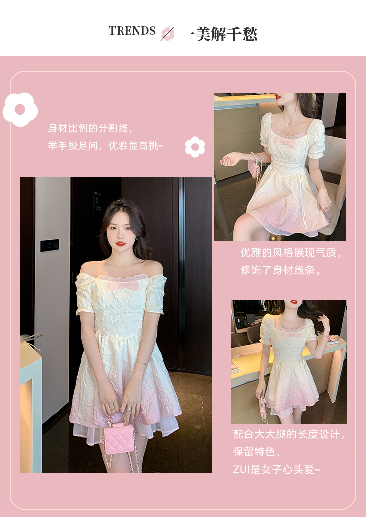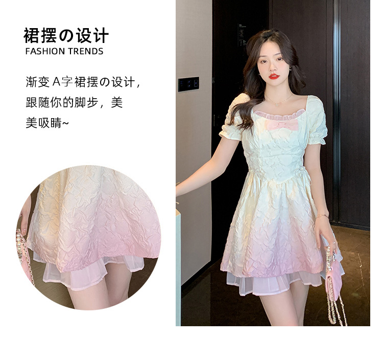RM5356#渐变色方领连衣裙女法式泡泡袖公主裙收腰显瘦甜美两穿一字肩