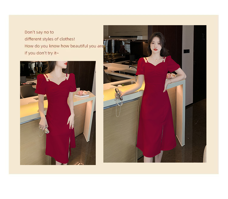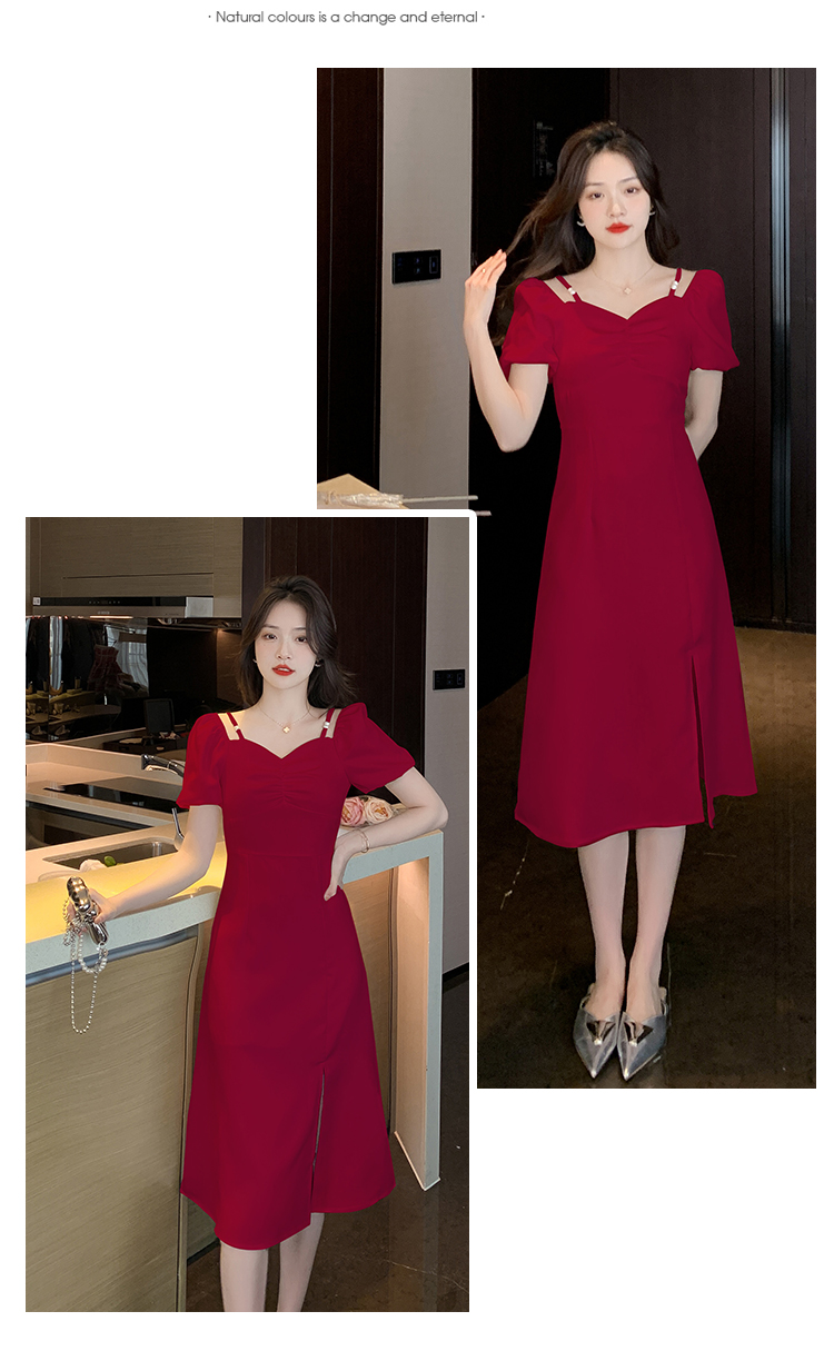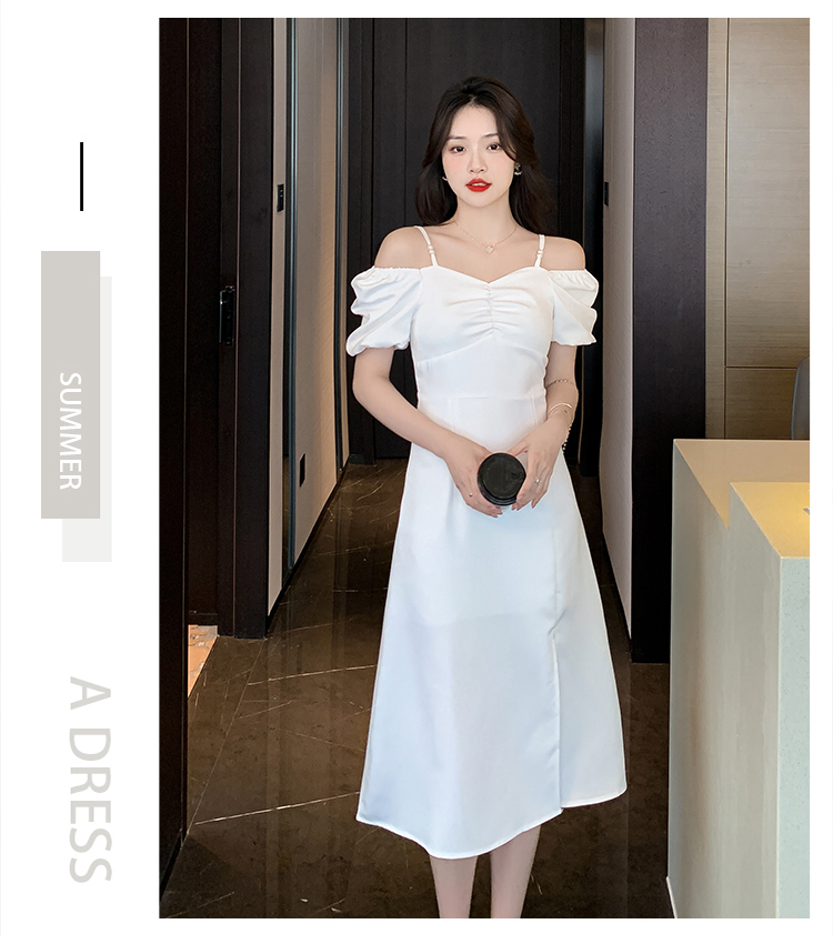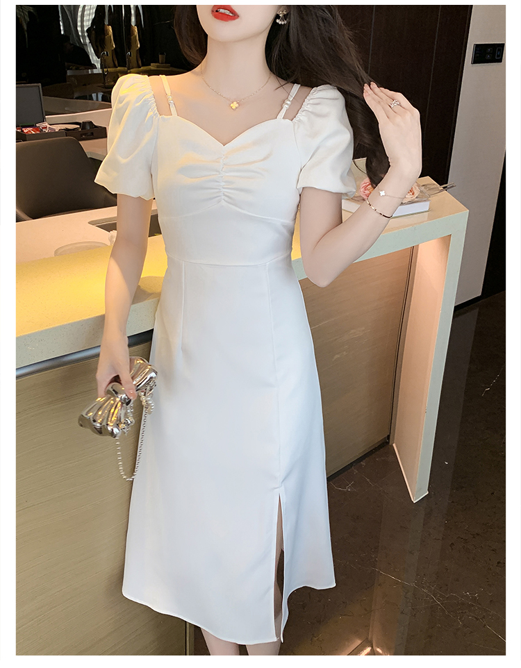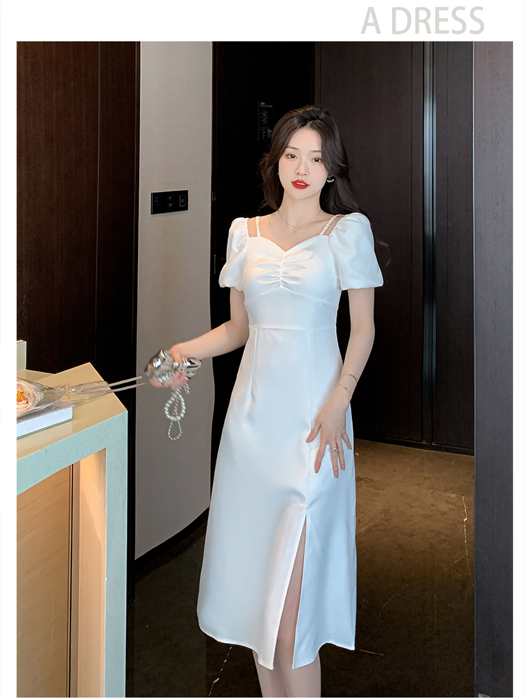 RM5357#法式复古泡泡袖白色夏季新款2023高腰开叉修身中长款连衣裙