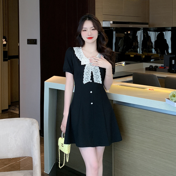 RM5362#夏季新款圆领甜美蕾丝蝴蝶结遮肉显瘦短款A字连衣裙