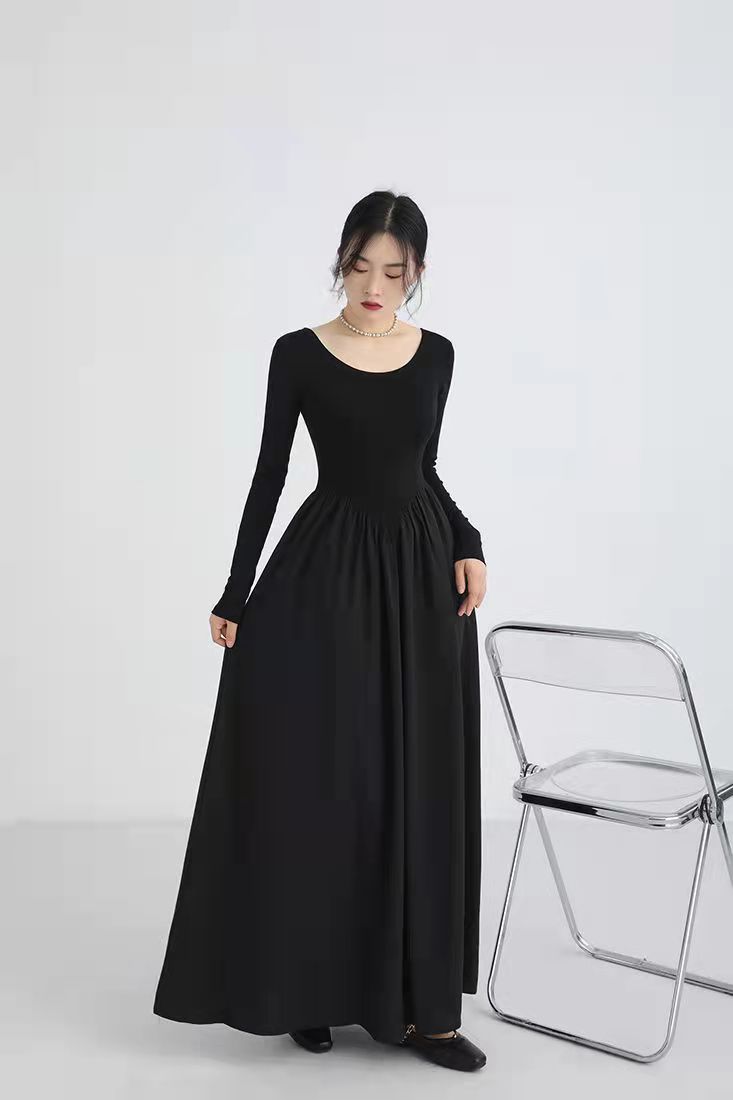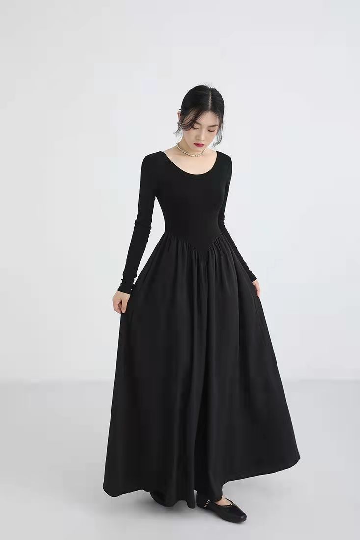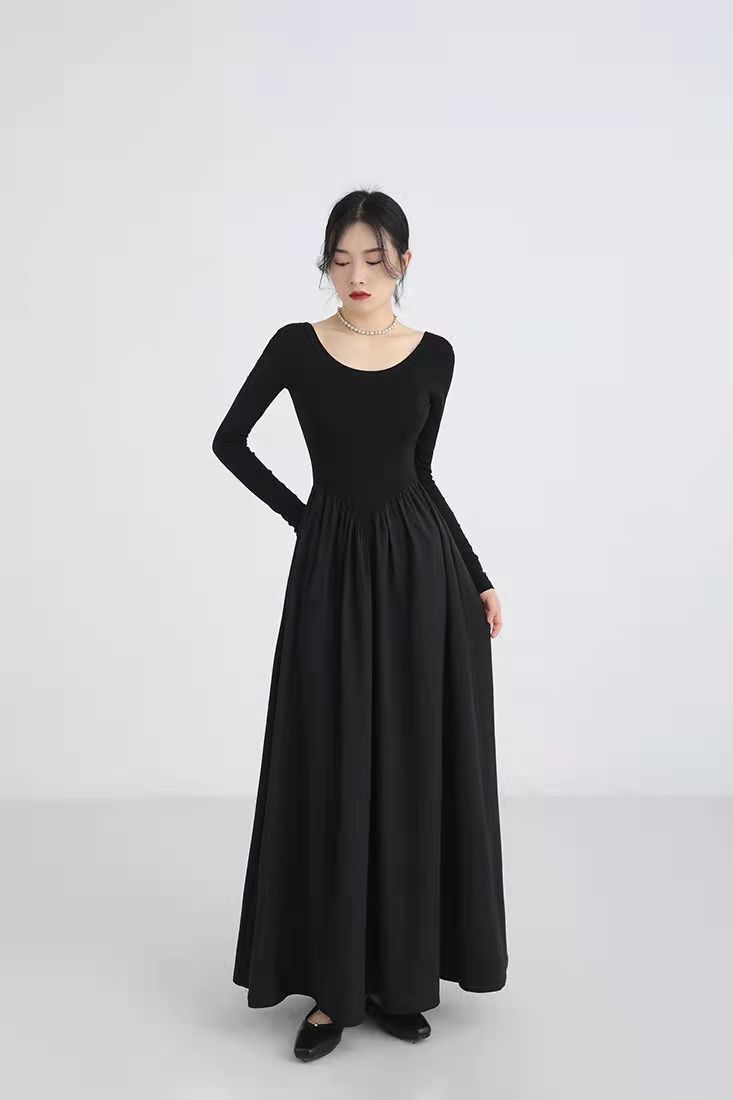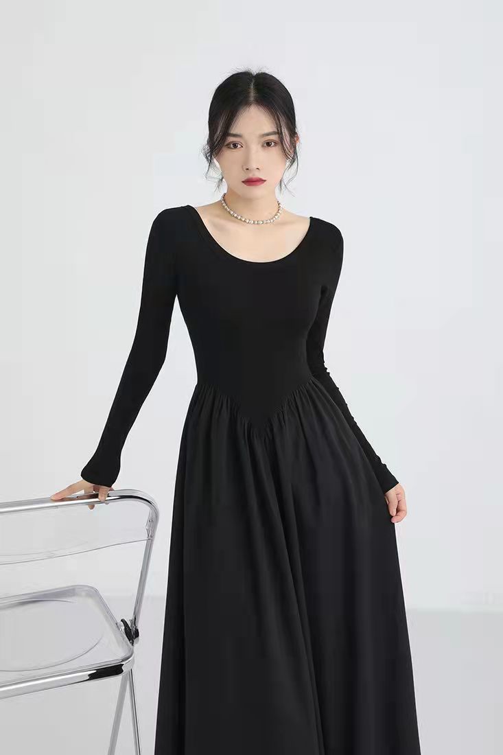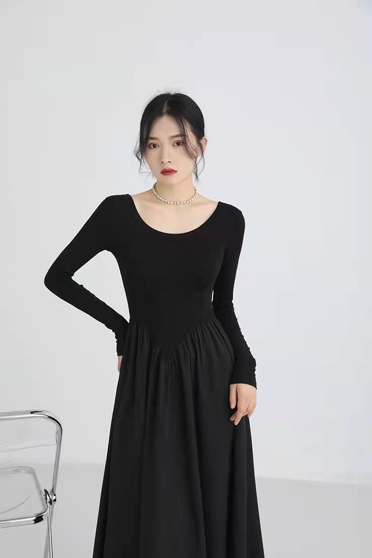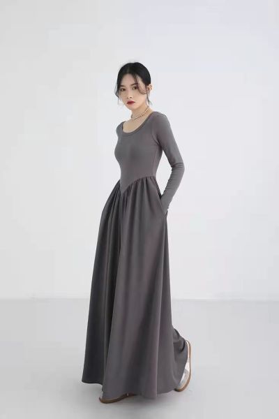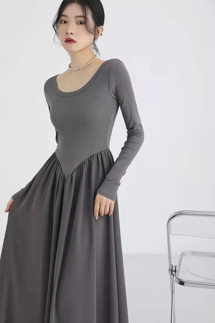 RM5243#法式灰色圆领针织拼接连衣裙女装2023春季新款设计高级感长裙