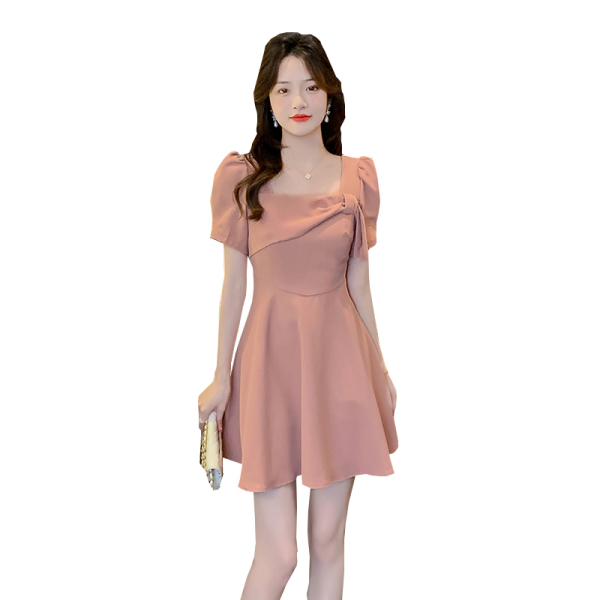 RM5259#夏季法式方领设计感蝴蝶结连衣裙韩版收腰显瘦短裙