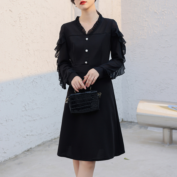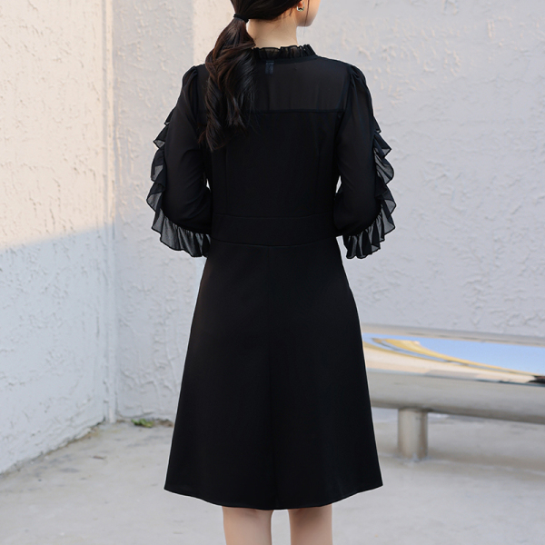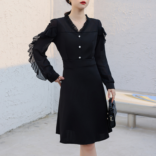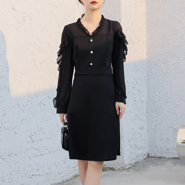 RM5079#夏季新款通勤木耳边拼接气质V领纯色韩版收腰中长款连衣裙