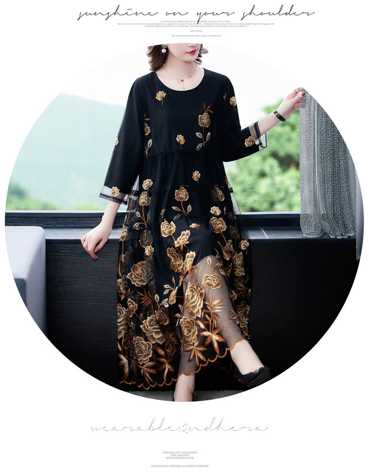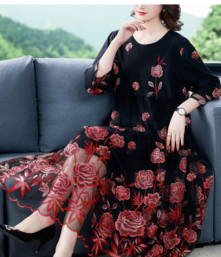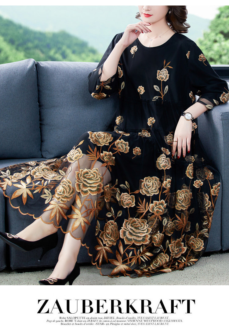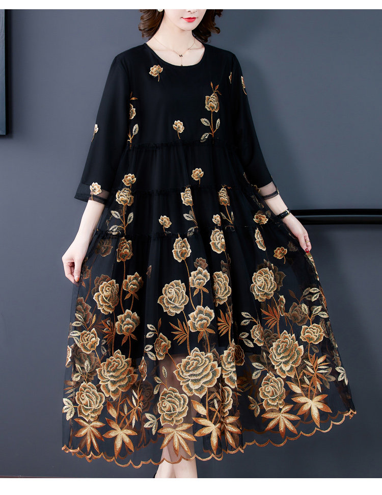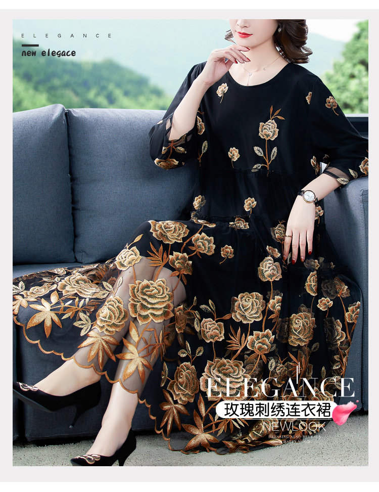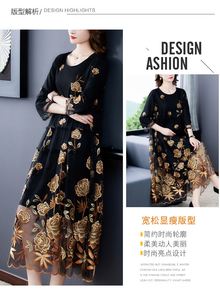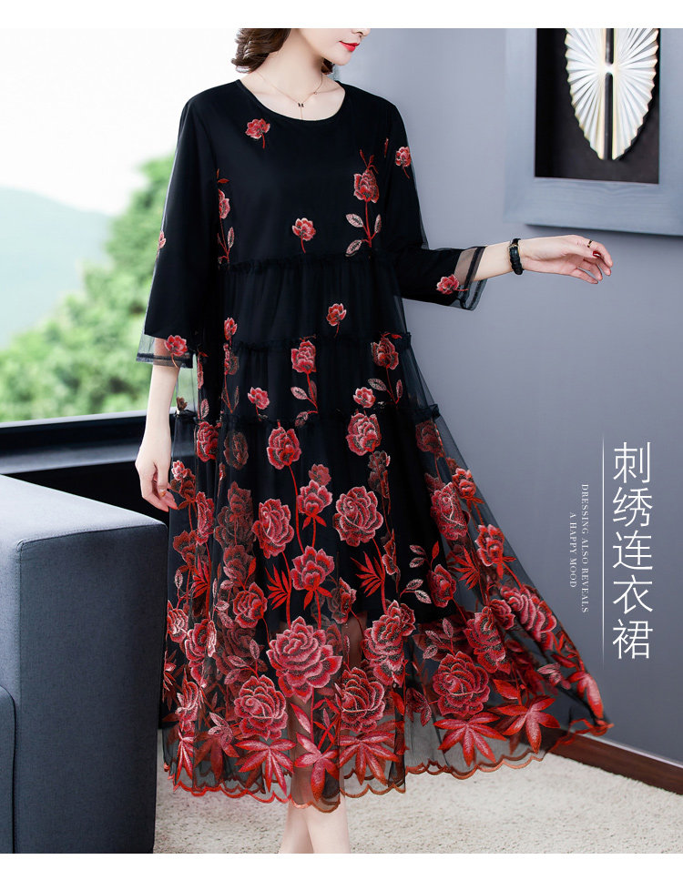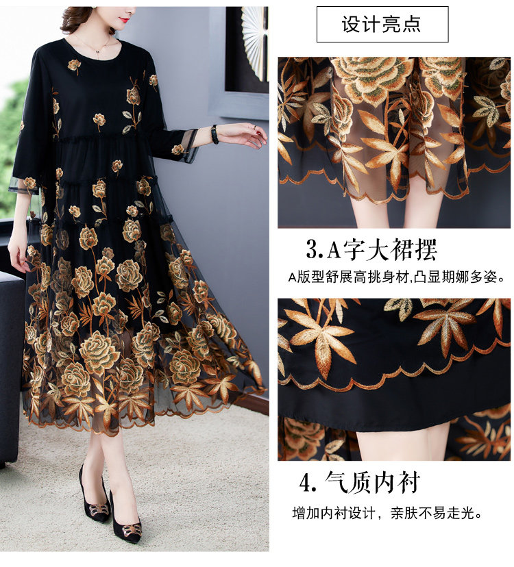 RM5171#重工刺绣连衣裙网纱绣花裙子妈妈裙秋新款A字裙大摆裙
