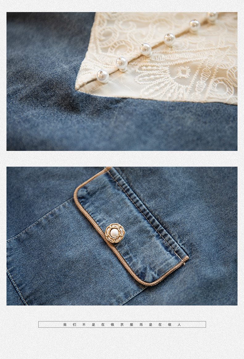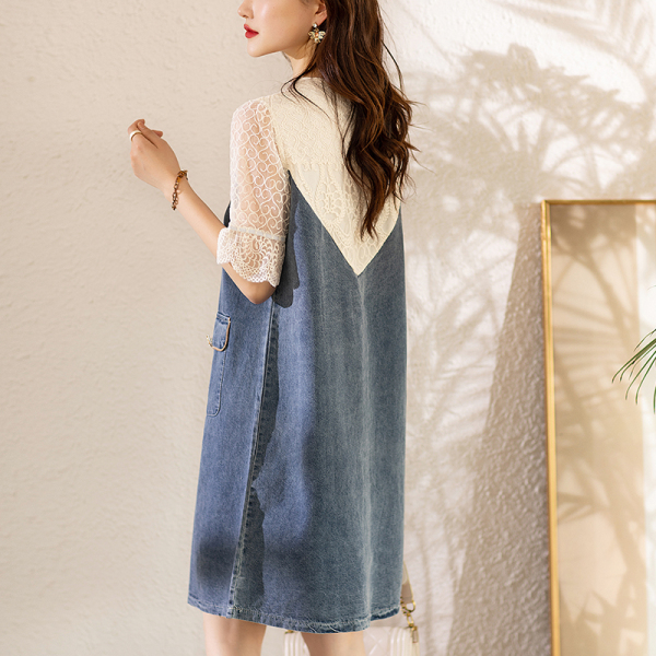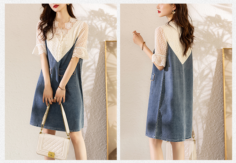 RM5338#V领网纱拼接牛仔女裙子夏装宽松显瘦气质直筒裙