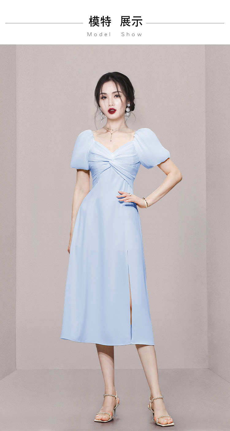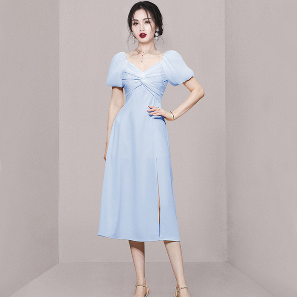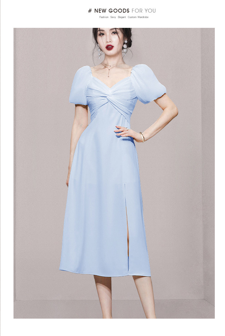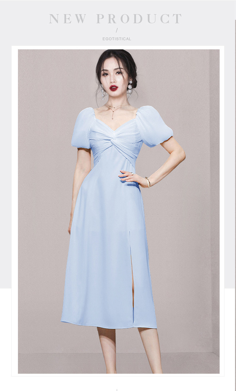 RM5419#夏季女装气质甜美通勤收腰显瘦短袖天蓝色中长款连衣裙