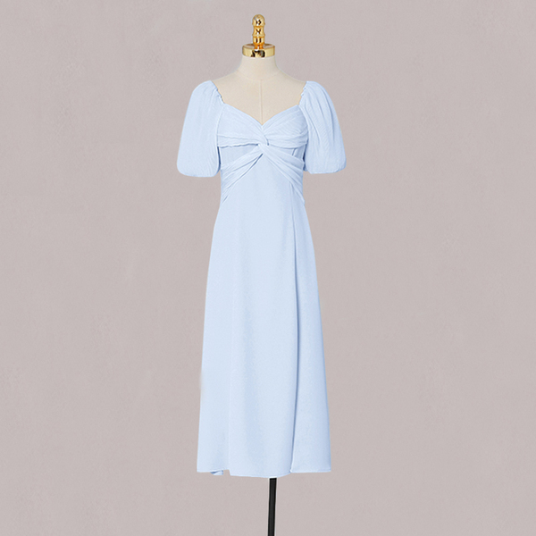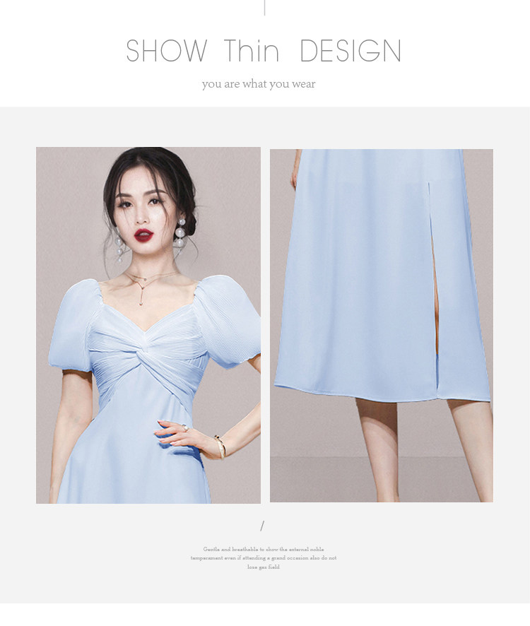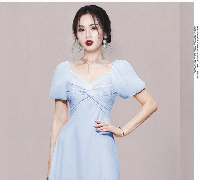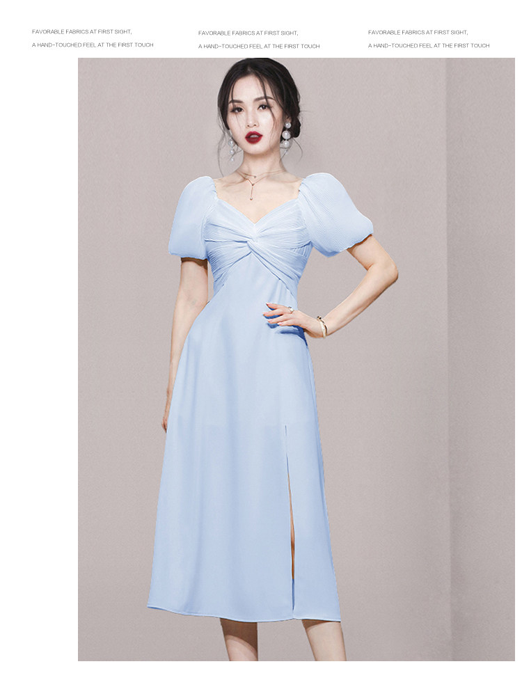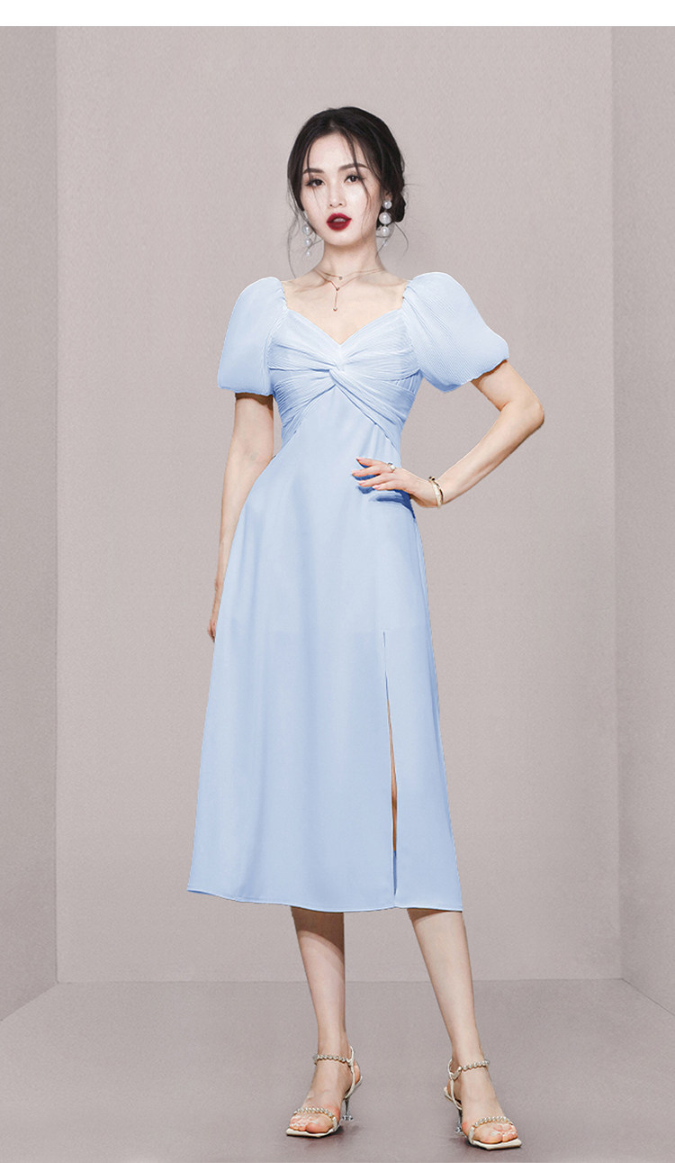 RM5419#夏季女装气质甜美通勤收腰显瘦短袖天蓝色中长款连衣裙
