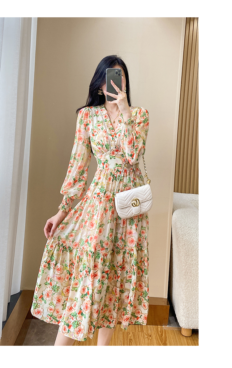 RM5461#碎花连衣裙女 新款高端精致v领收腰海边度假长裙桔梗法式