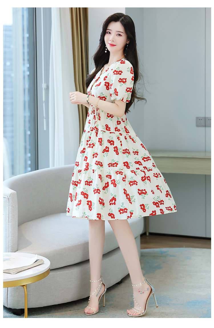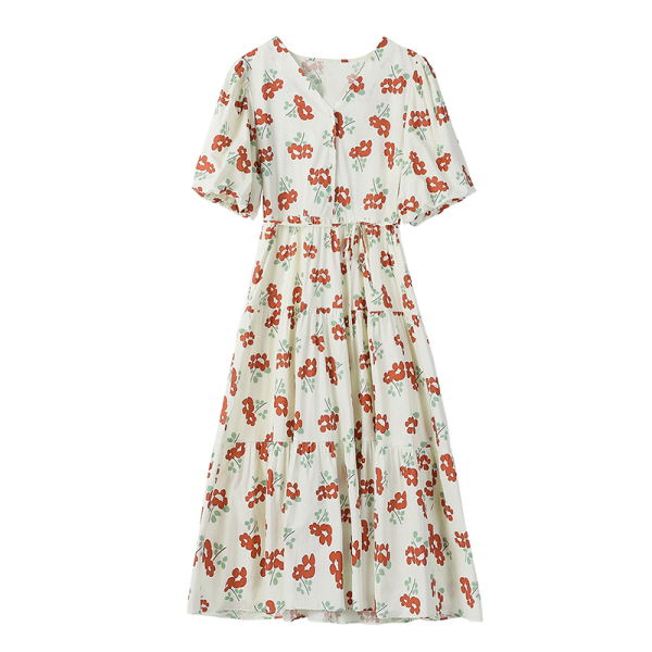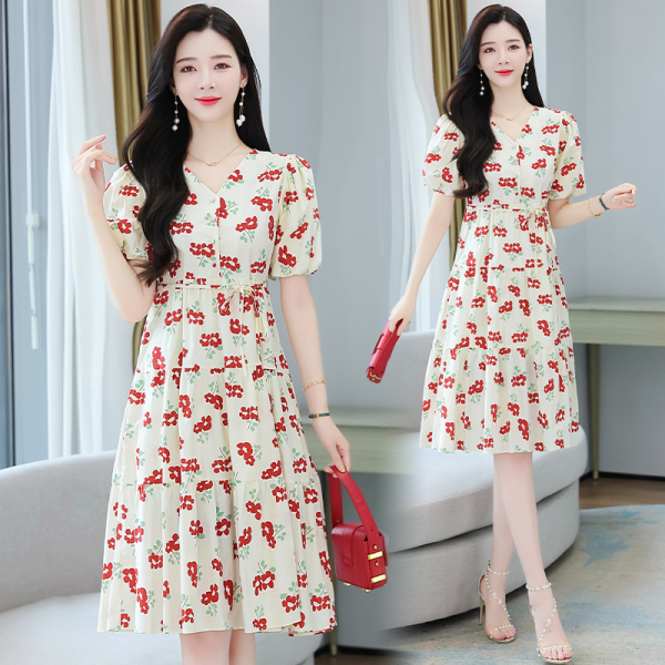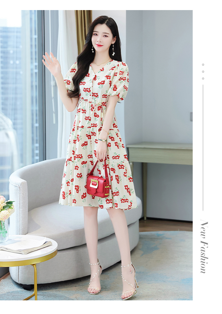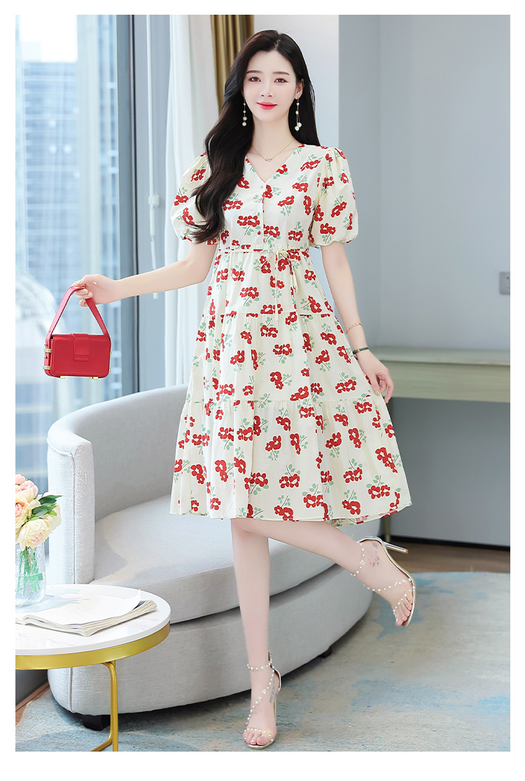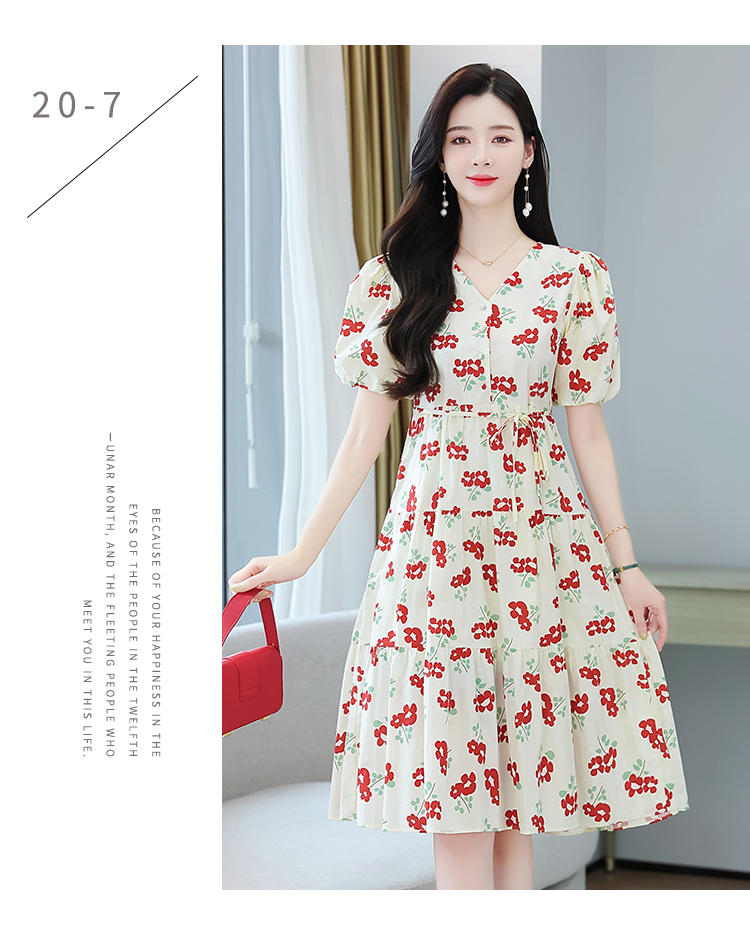 RM5549#红花绑带连衣裙泡泡袖A字碎花裙小个子仙女裙