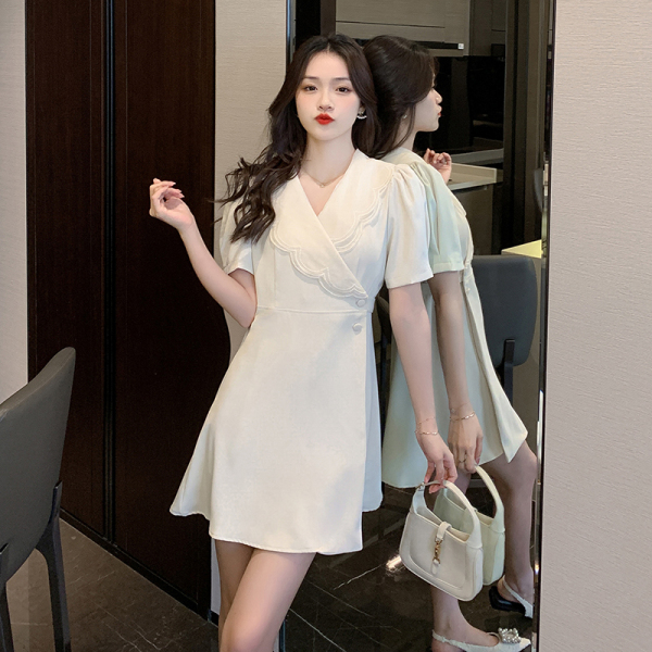 RM5567#夏季新款时尚V领大翻领收腰显瘦短款A字连衣裙