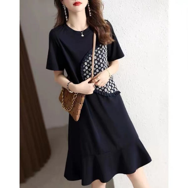 RM5675#拼接装饰2023夏季收腰气质显瘦连衣裙时尚气质裙子短袖