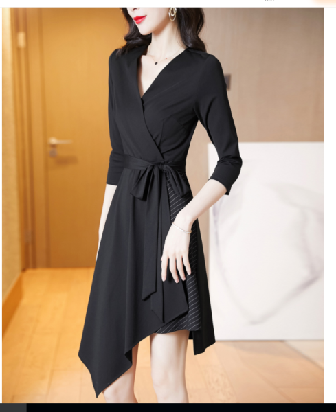 RM5694#黑色修身显瘦气质V领拼接条纹不规则中长款连衣裙子