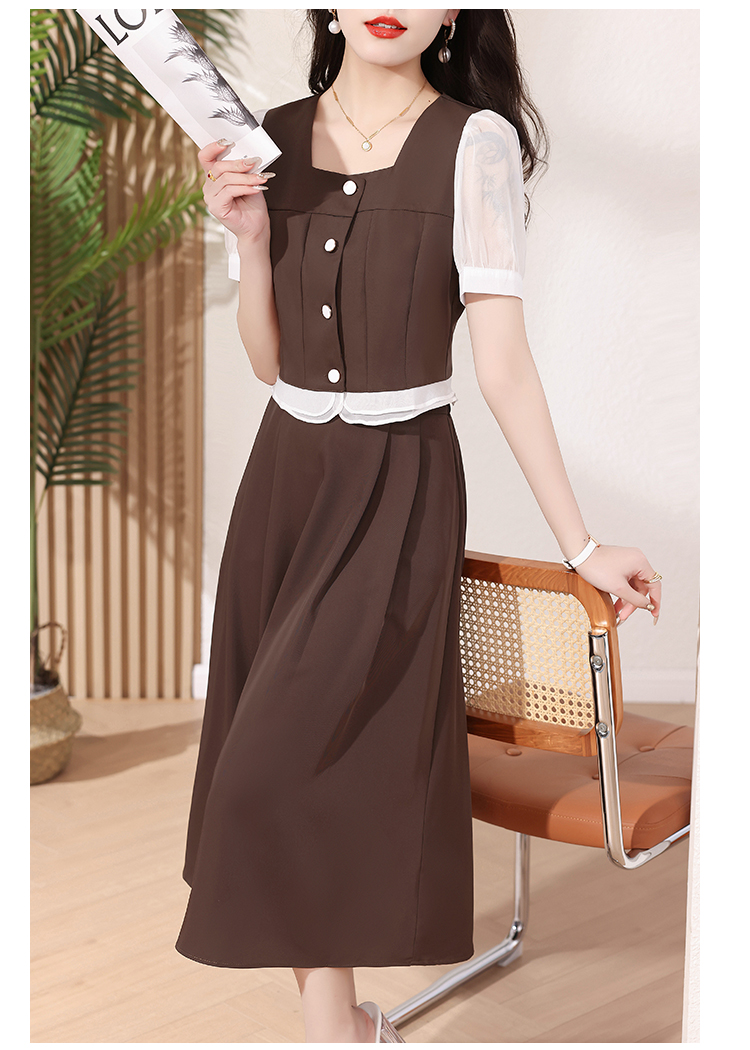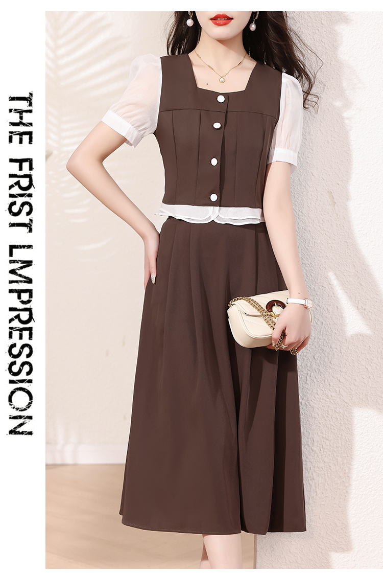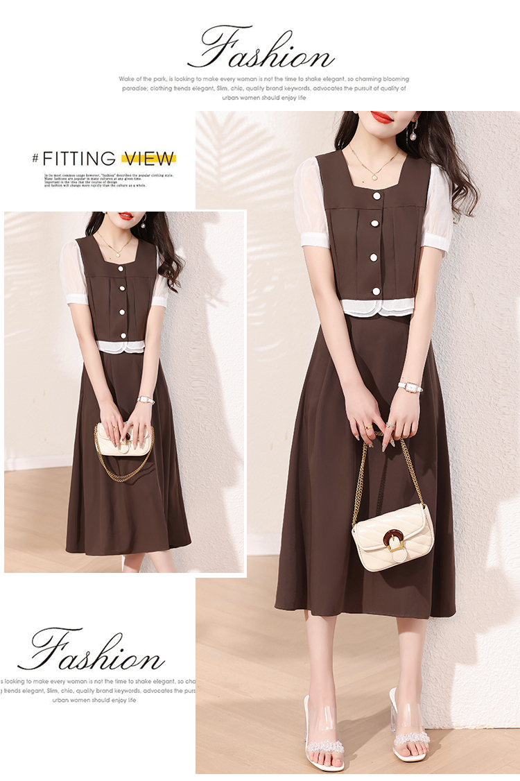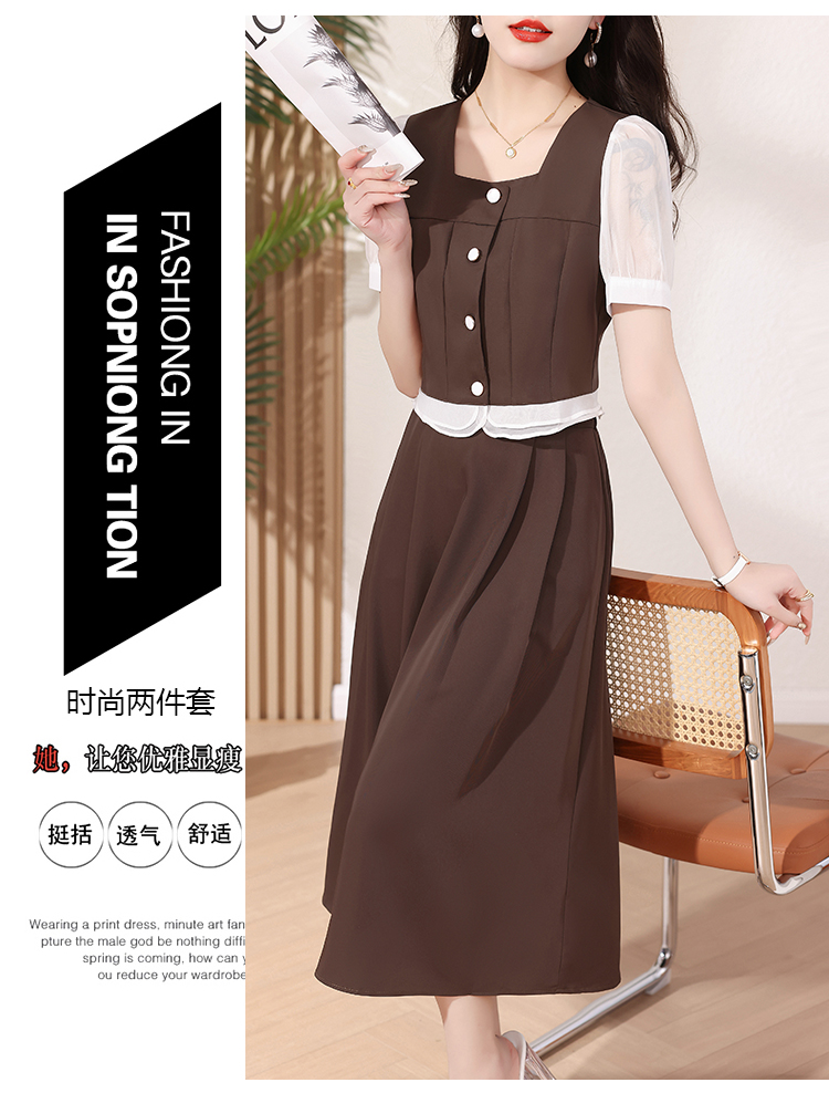 RM5745#夏季新款套装女法式复古名媛微胖茶系穿搭显痩方领连衣裙