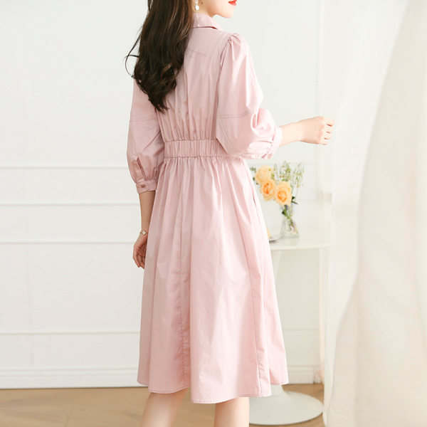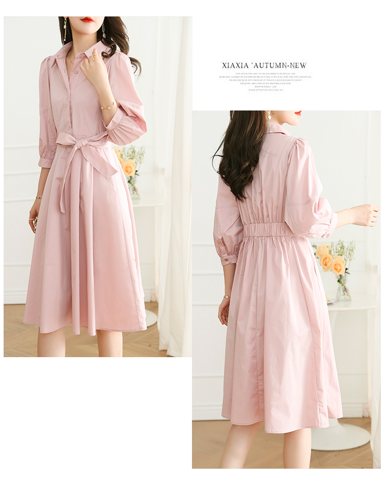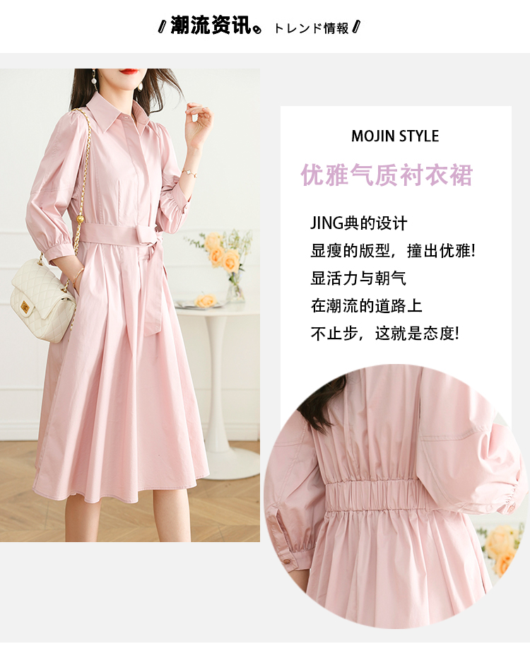 RM5742#真纯棉~2023夏季新款粉色收腰休闲翻领连衣裙气质简约长袖衬衫裙