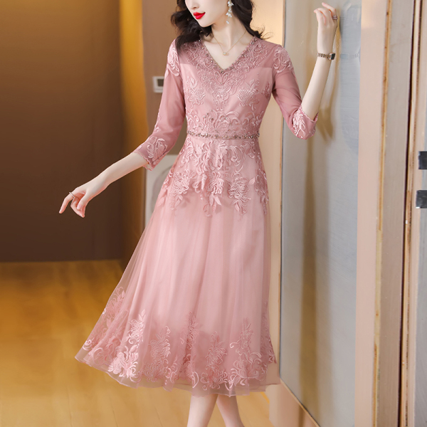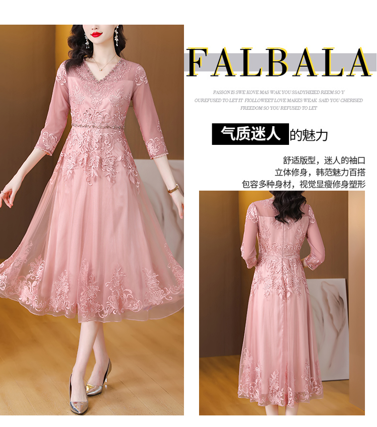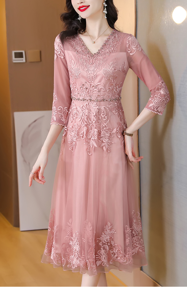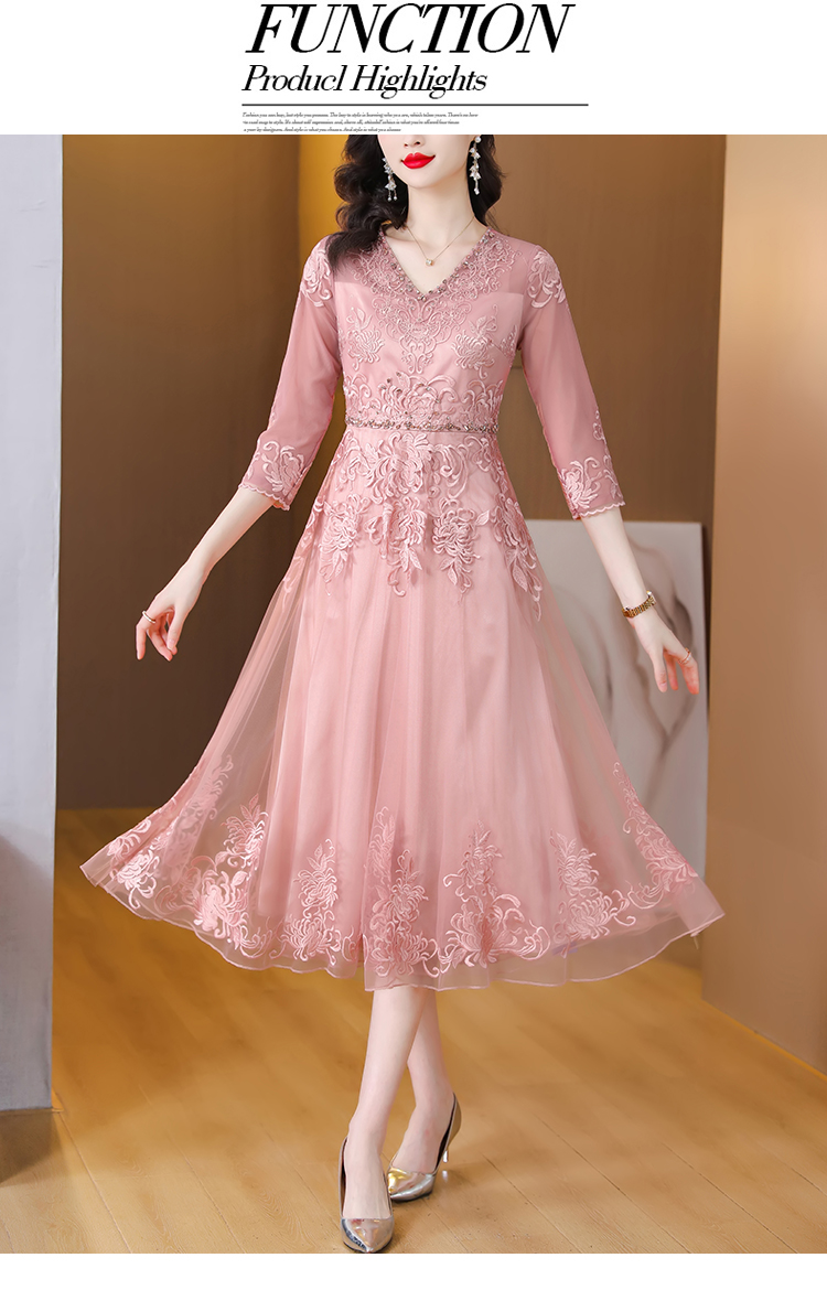 RM5752#名媛气质重工绣花网纱连衣裙女2023春夏新款V领镶钻刺绣长裙
