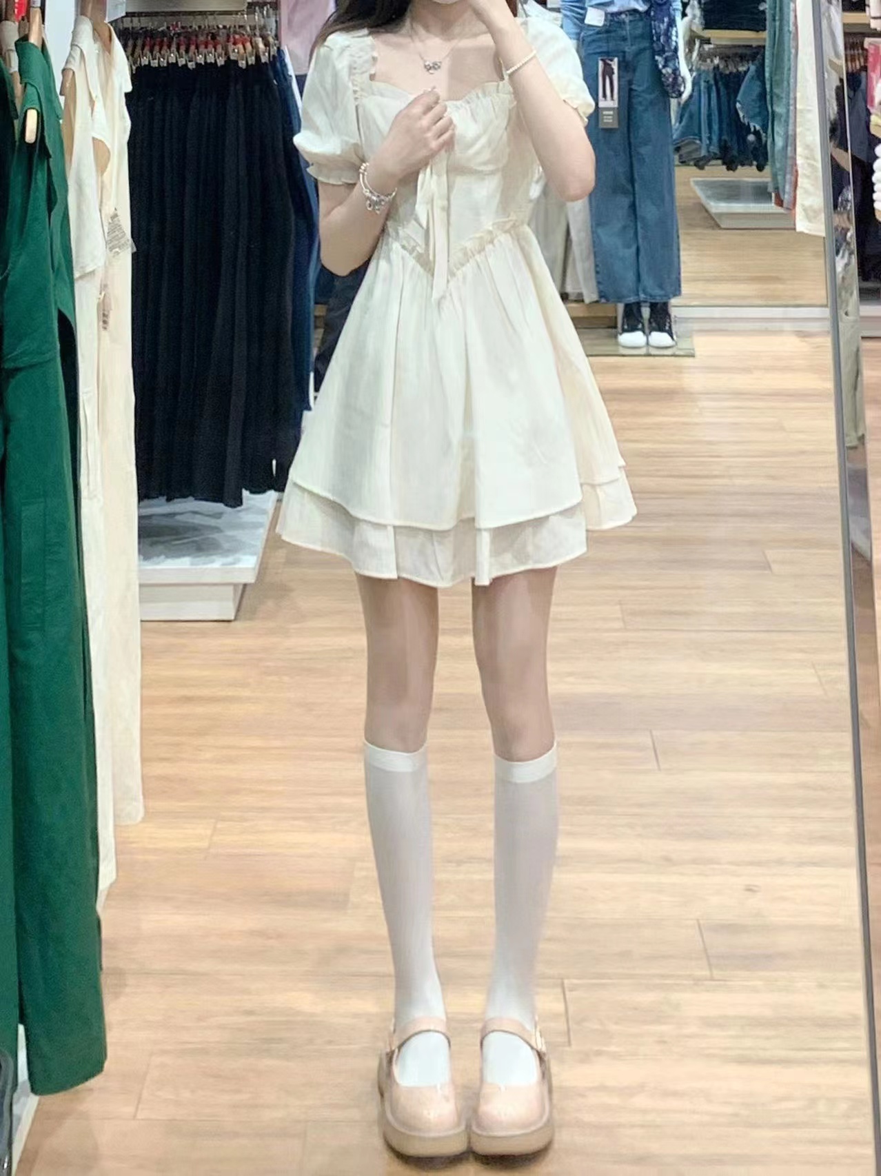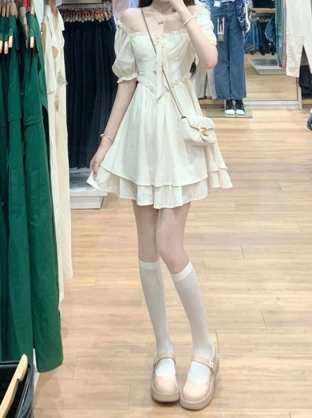 RM5783#纯欲白色连衣裙子茶歇法式初恋甜辣妹设计感小众泡泡袖仙女裙夏季