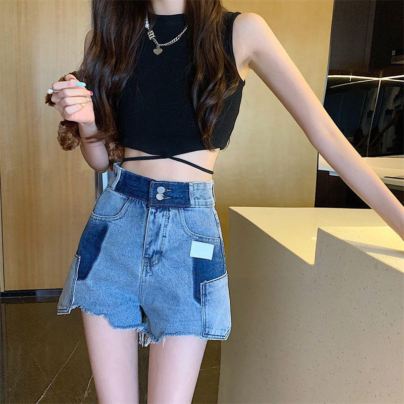 RM7624#拼接毛边高腰牛仔短裤女2023夏季宽松显瘦百搭a字直筒阔腿裤ins潮