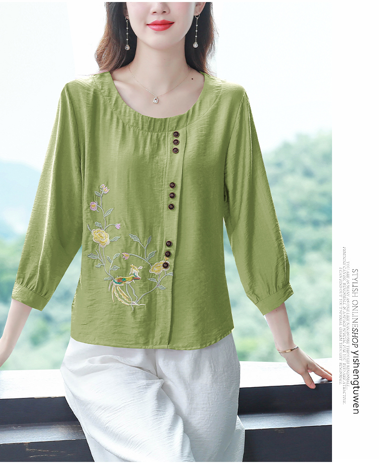 RM9603#春夏时尚棉麻绣花大码女士上衣百搭圆领显瘦洋气妈妈装