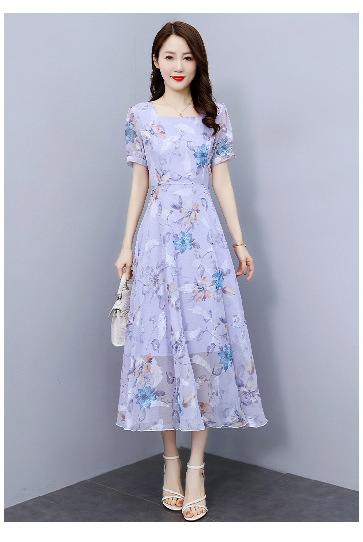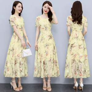 RM11698#夏季新款中袖拼接高腰长裙领撞色印花大摆雪纺气质连