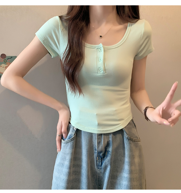 RM13124#法式半开领纽扣短袖t恤女夏季别致纯欲正肩短款上衣