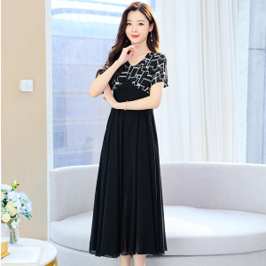 RM24085#夏季黑色雪纺拼接连衣裙女长款到脚踝正式场合超长显瘦大摆假两件