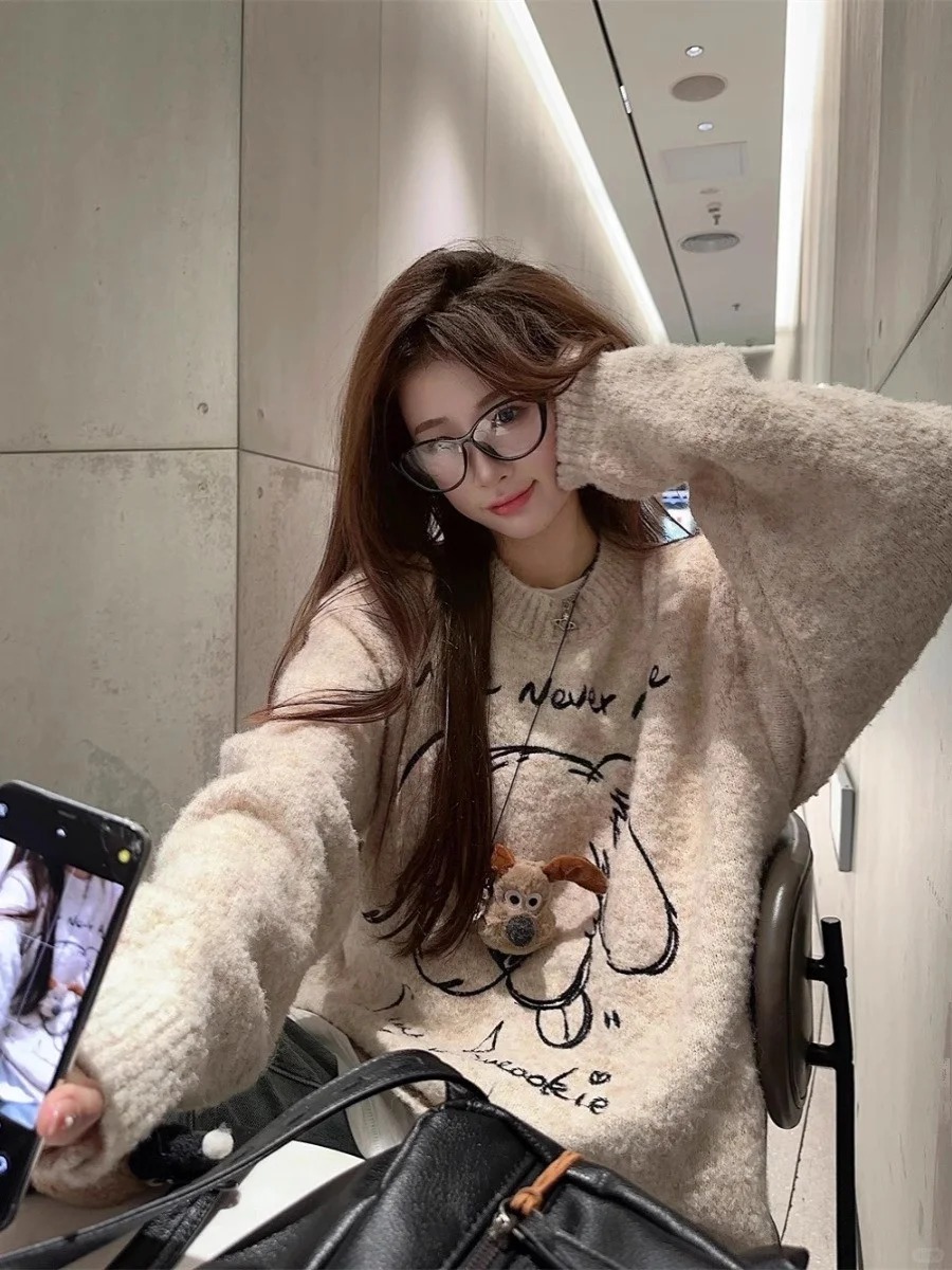 PF28869#慵懒感小狗圆领针织毛衣女秋季新款宽松百搭套头上衣女裝貨源服裝批發