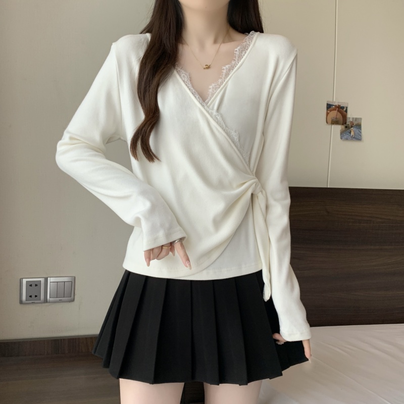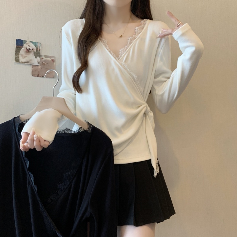PF28918# 大码胖mm一片式收腰上衣高级感蕾丝花边V领黑色针织衫女裝貨源服裝批發
