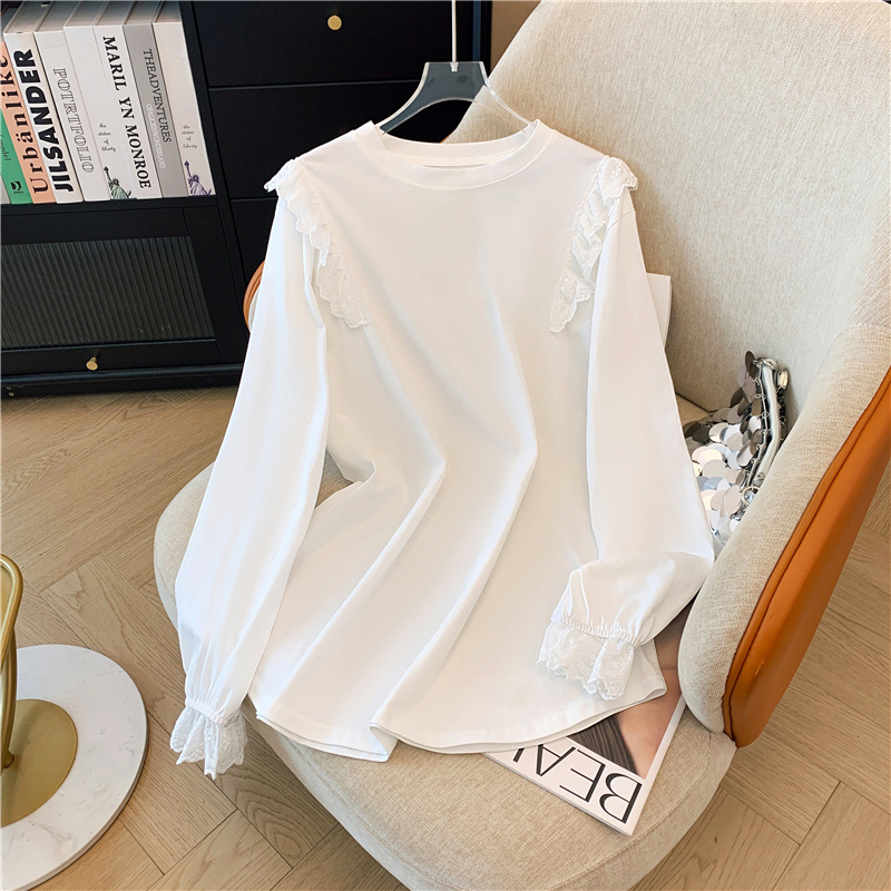 PF28944#大码白色纯棉蕾丝拼接中长T恤宽松打底外穿长袖上衣女裝貨源服裝批發