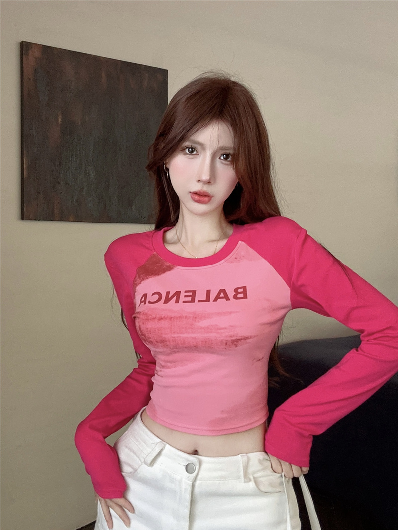 MY2750#设计感扎染字母印花拼接长袖美式辣妹修身上衣女裝貨源服裝批發