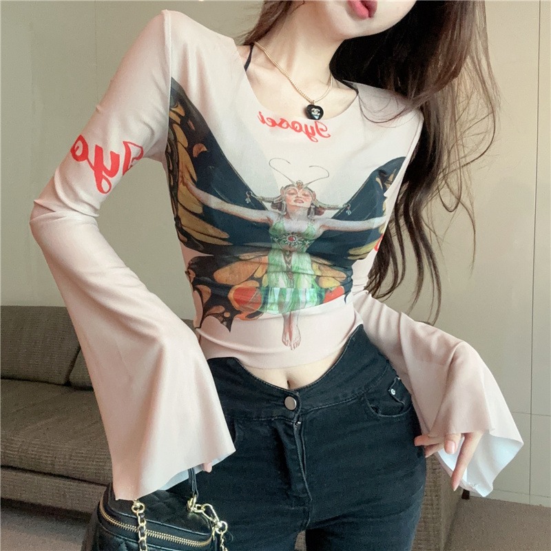 MY2751#新款辣妹人像图案印花网纱短款T恤打底衫上衣女女裝貨源服裝批發