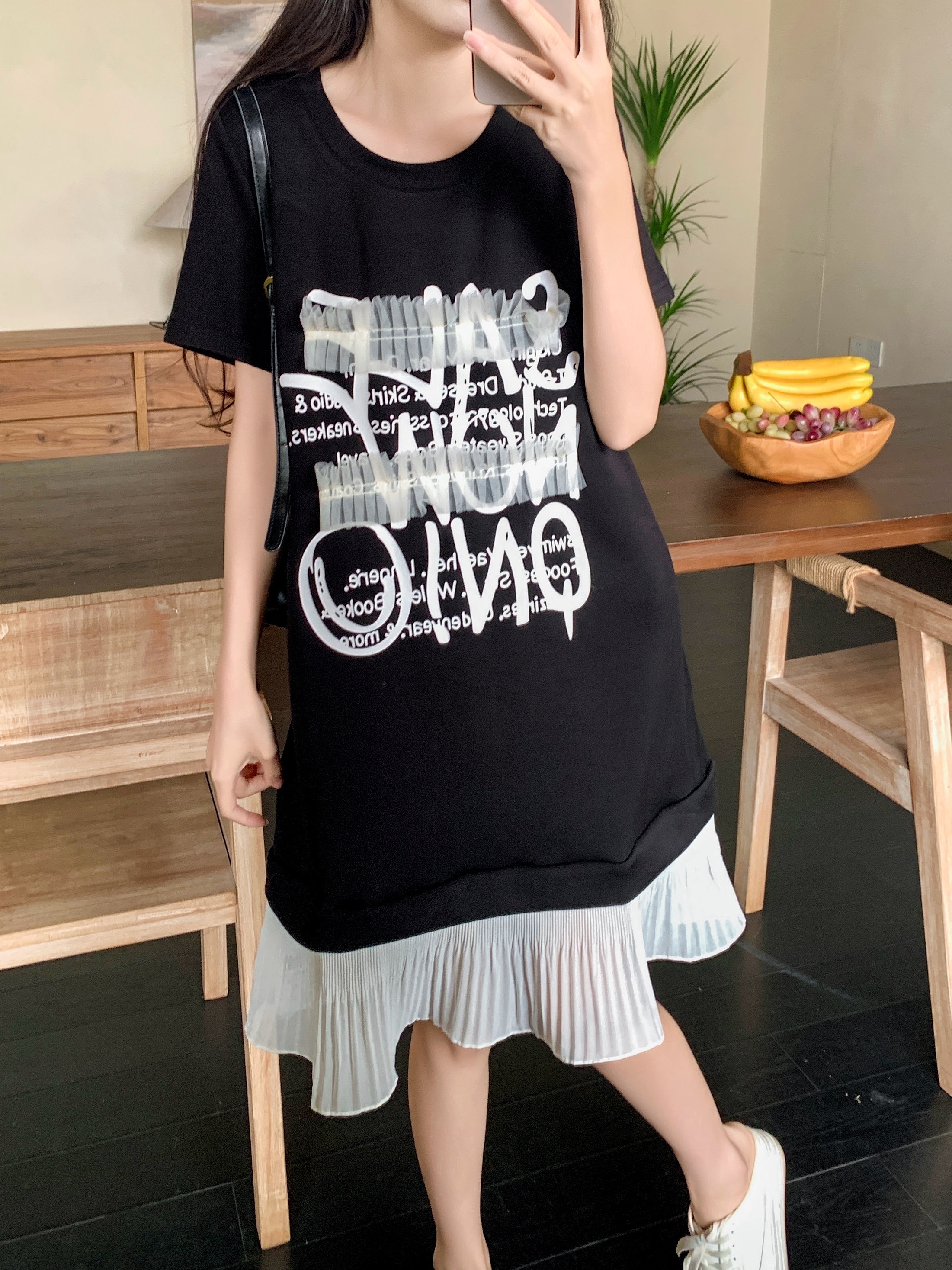 MY3076# 法式洋气字母印花连衣裙女大码胖MM宽松显瘦蕾丝拼接裙子女裝貨源服裝批發