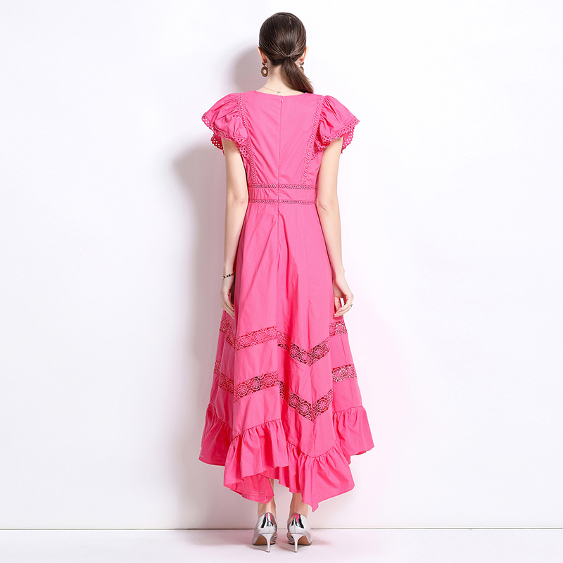 MY6635# 欧美度假风连衣裙V领飞飞袖镂空蕾丝拼接连衣裙女裝貨源服裝批發