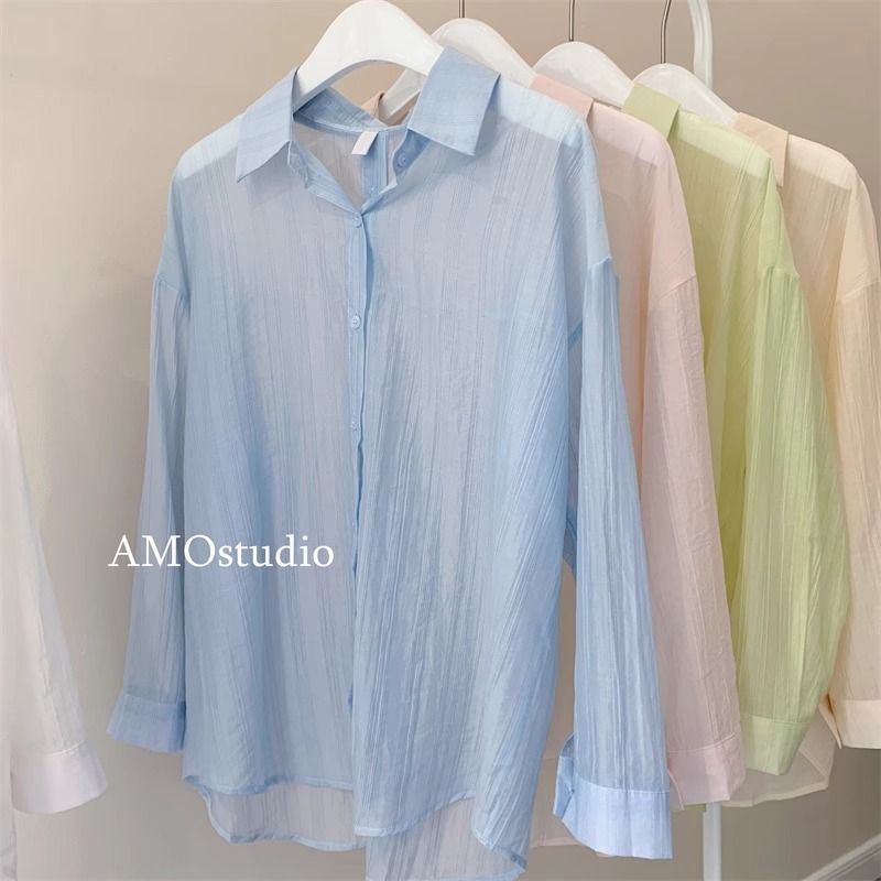 MY6712# 粉色女防晒宽松夏季衬衫长袖开衫背面开叉系带半透雪纺薄款衬衣女裝貨源服裝批發