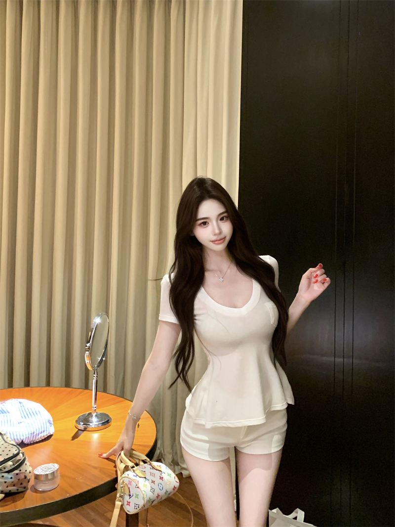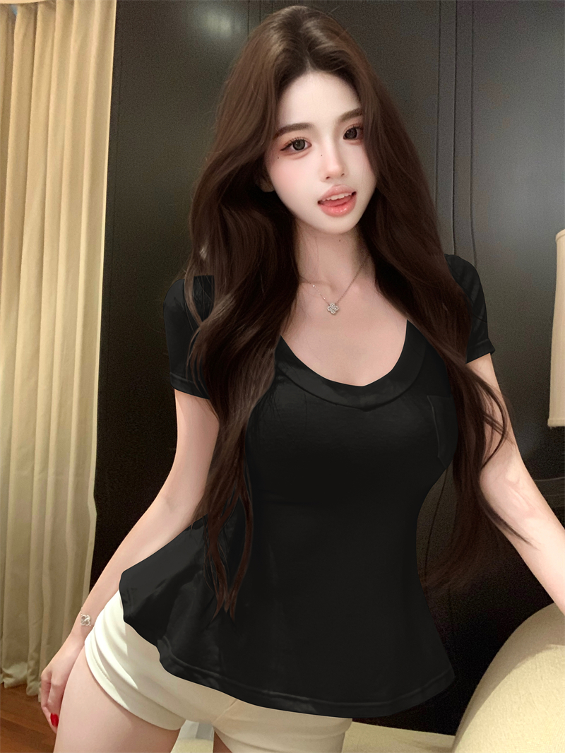 MY6756# 纯欲微透清凉掐腰V简约慵懒短袖上衣女裝貨源服裝批發